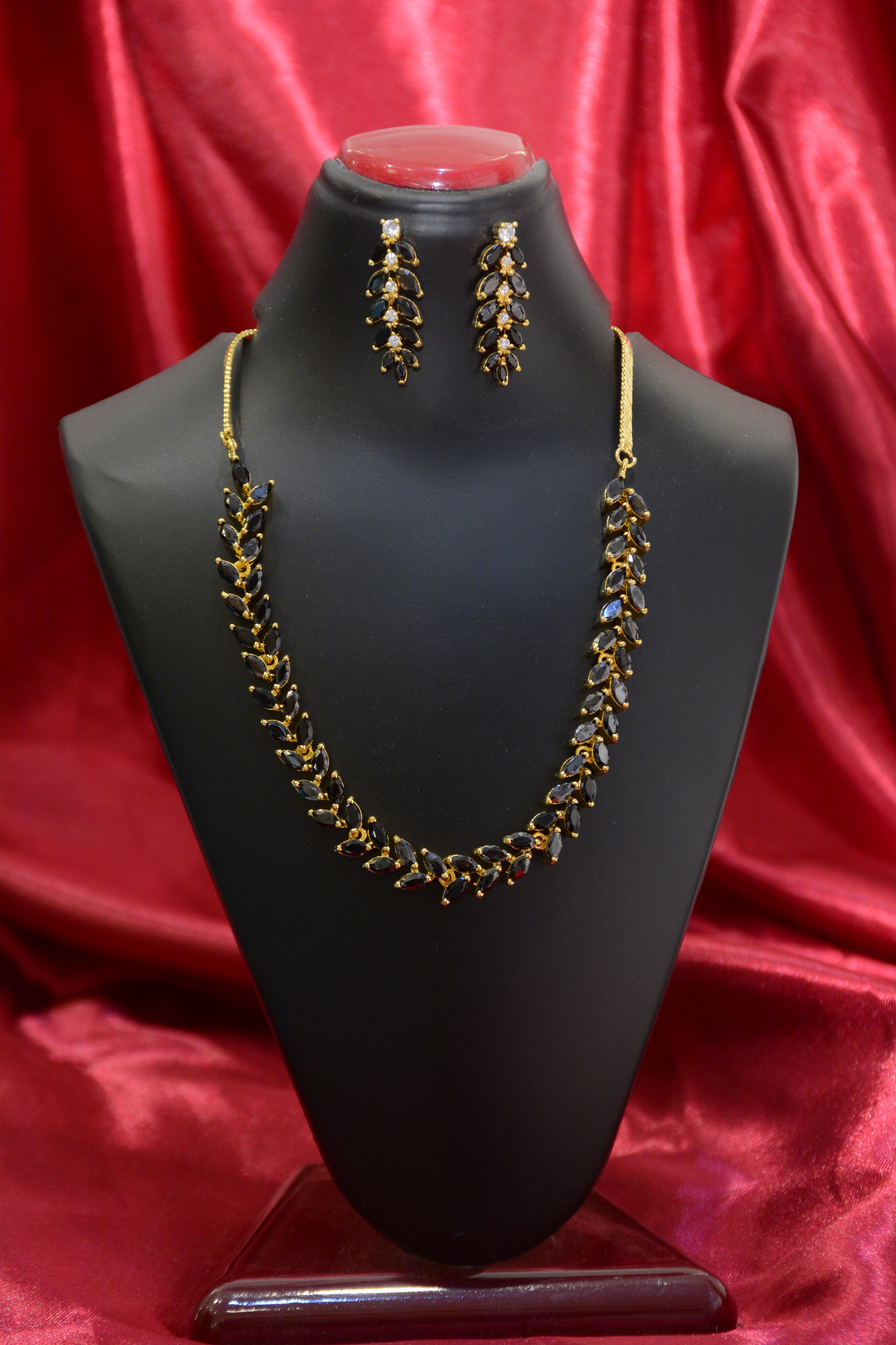 Make a bold yet elegant statement with this AD black and gold plated necklace set, featuring sparkling American Diamonds contrasted with striking black stones in a radiant gold finish. The set includes a finely crafted necklace and matching earrings, perfect for weddings, receptions, parties, and festive occasions.