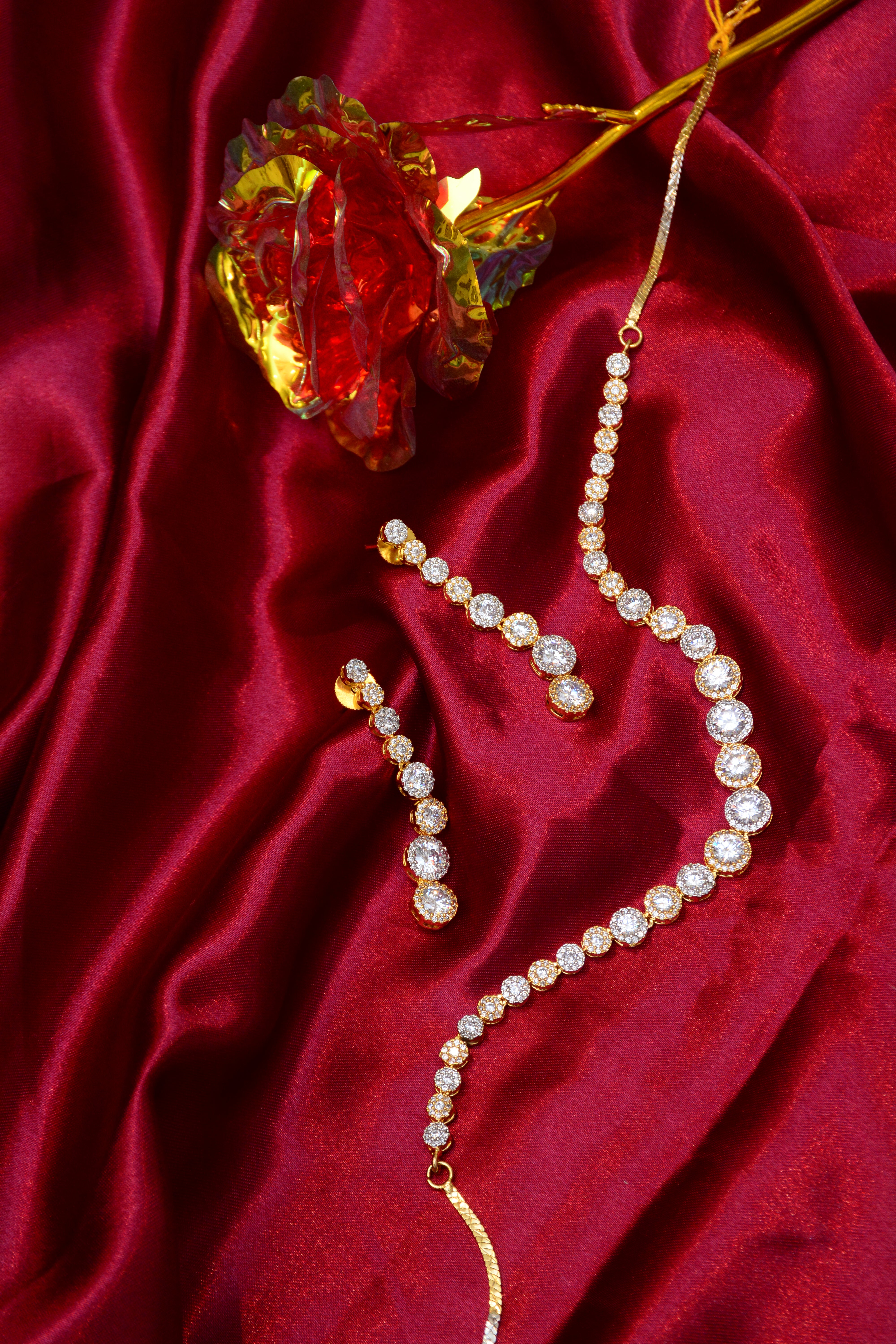 Shine with sophistication in our AD Gold Plated Necklace Set, crafted with sparkling American Diamonds that exude timeless elegance. The radiant gold-plated finish perfectly complements the brilliance of the stones, making it ideal for weddings, parties, and festive occasions. This set includes matching earrings for a complete, coordinated look. Lightweight yet luxurious, it’s a versatile accessory that pairs beautifully with both traditional and modern outfits.