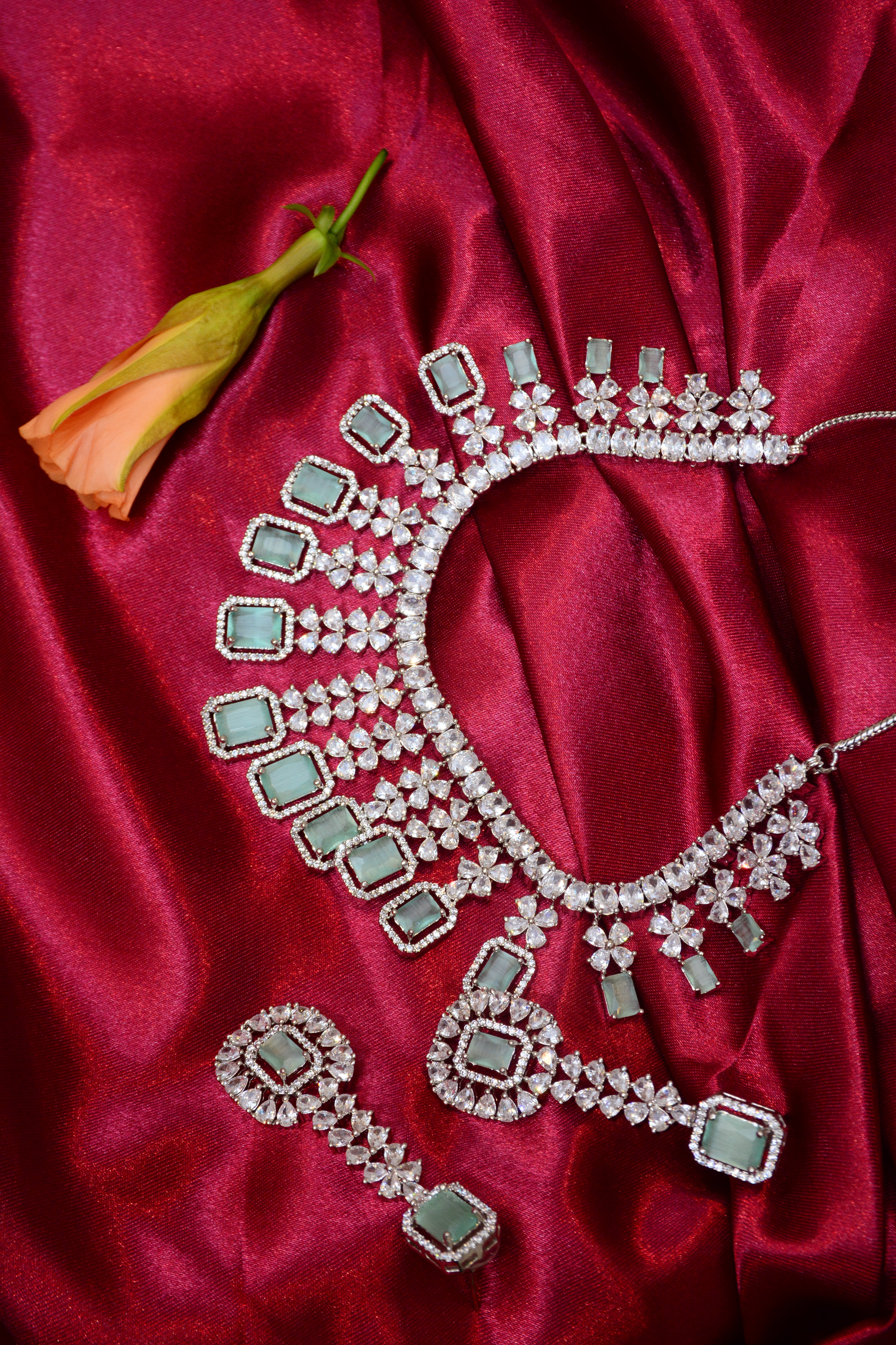 Make an unforgettable style statement with our AD Teal Silver Plated Necklace Set, featuring shimmering American Diamonds paired with a striking teal stone centerpiece. The sleek silver-plated finish enhances the sparkle of the stones while adding a touch of modern elegance. Perfect for weddings, parties, and festive occasions, this versatile set includes matching earrings for a polished, coordinated look. Lightweight yet luxurious, it complements both traditional and contemporary outfits beautifully.