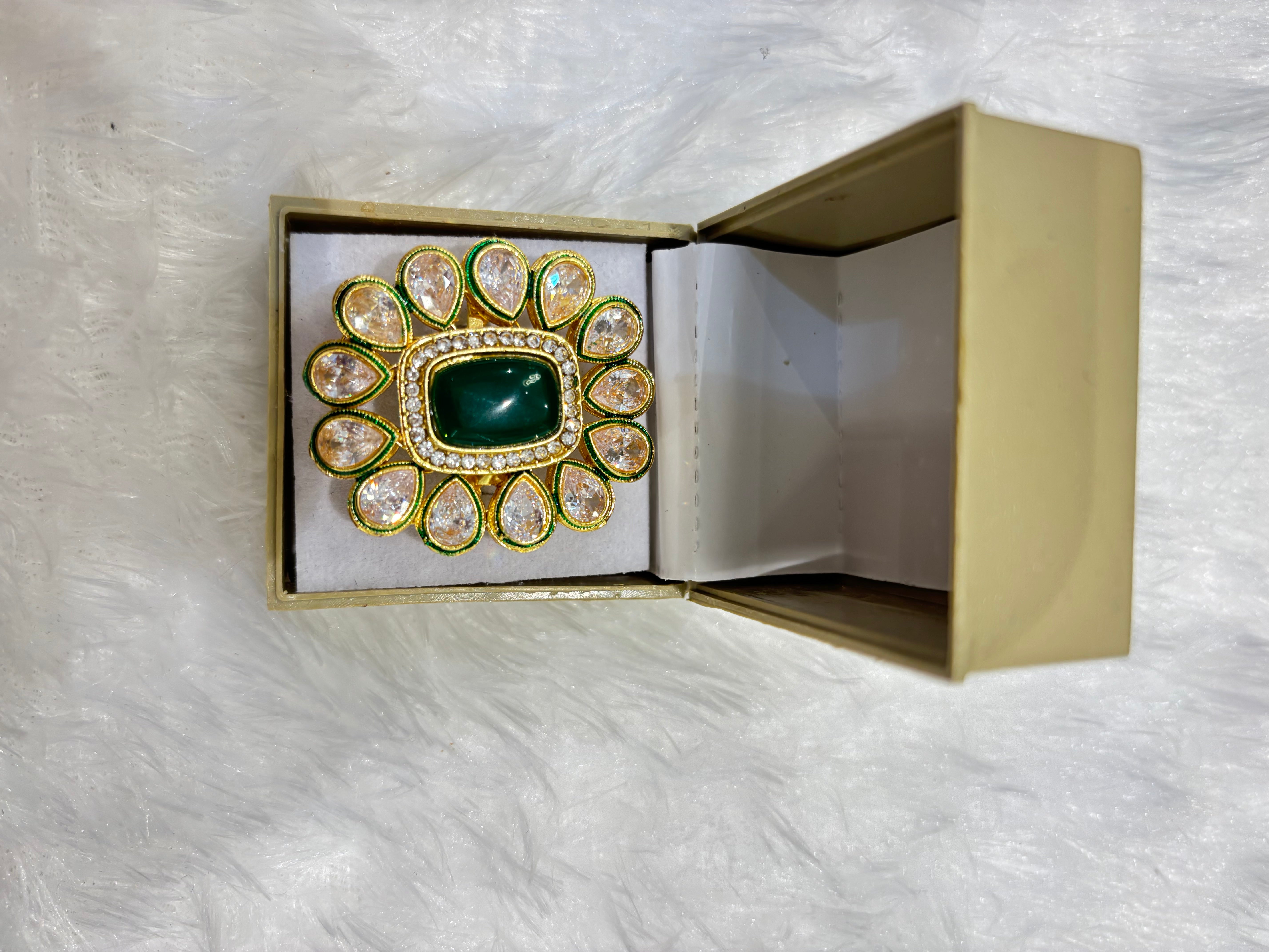 Elevate your style with this big elegant Kundan ring, featuring intricate Kundan work that exudes luxury and sophistication. Perfect for weddings, festive occasions, and ethnic celebrations, this adjustable ring is a statement piece that complements traditional attire while adding timeless elegance.