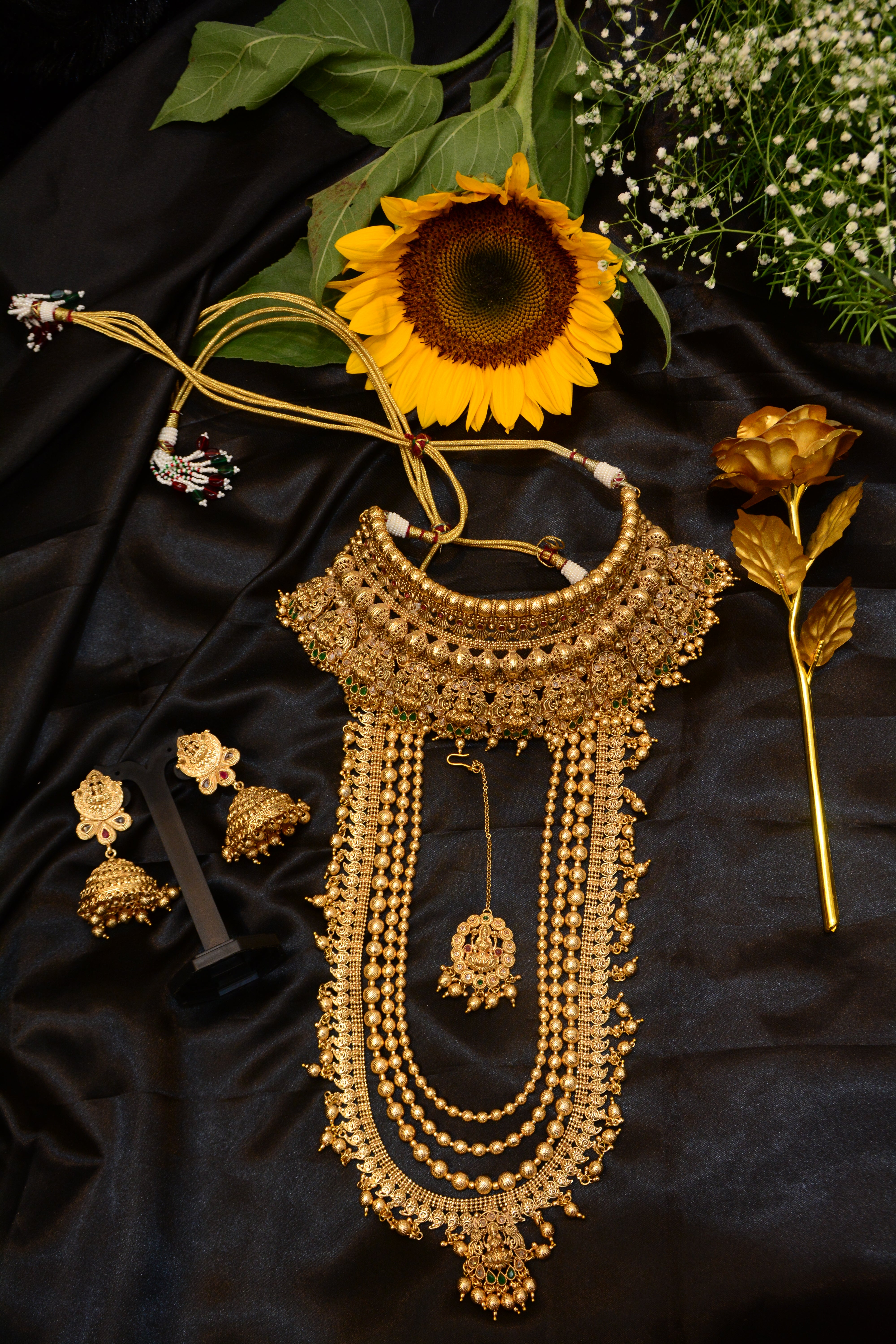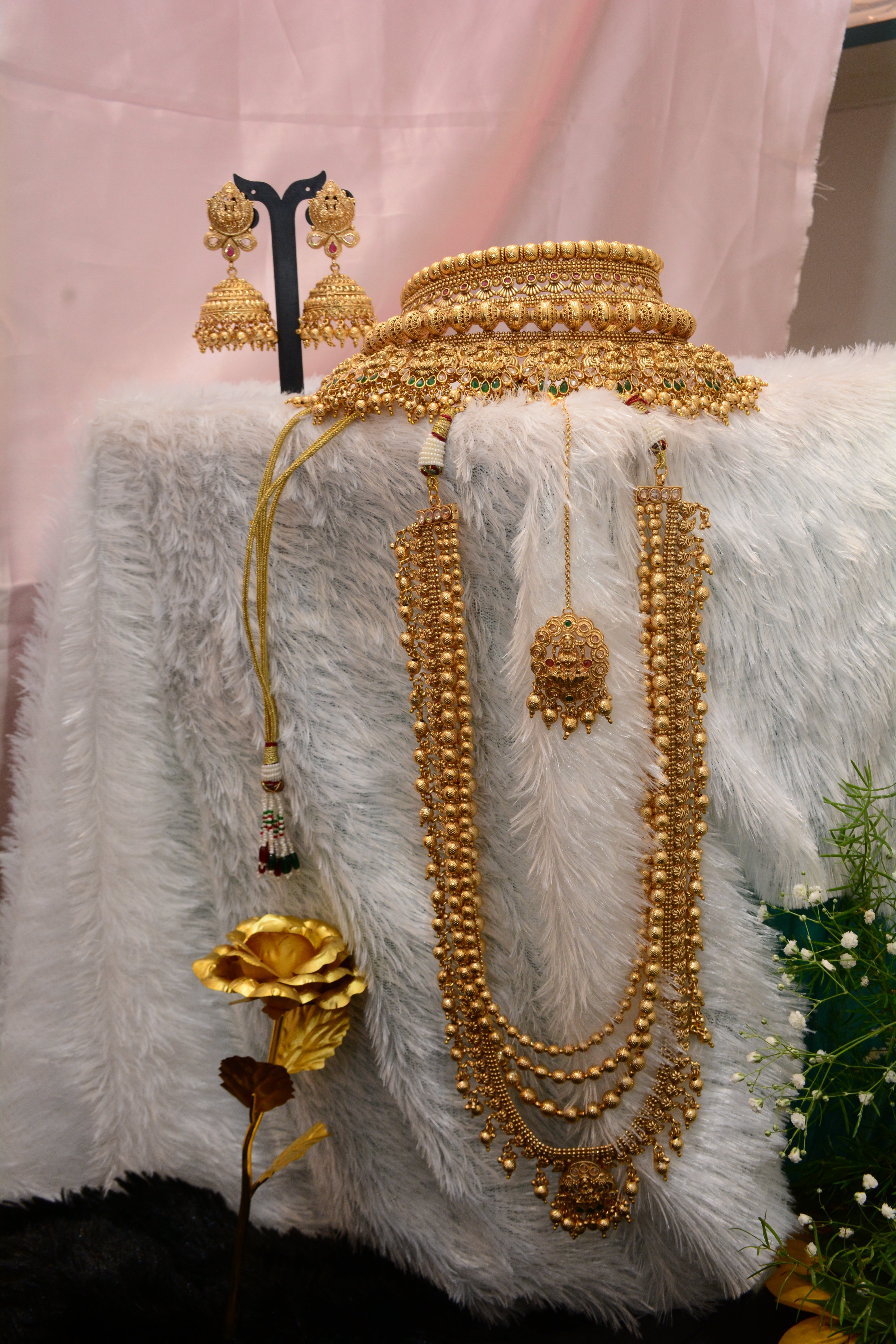 Complete your bridal look with this exquisite Gold Plated Choker and Long Necklace Set, designed to blend traditional elegance with timeless craftsmanship. The intricately detailed choker sits gracefully on the neckline, while the matching long necklace adds regal charm and sophistication. Perfect for weddings, receptions, and festive celebrations, this set comes with matching earrings for a flawless, coordinated style. Crafted with a radiant gold plating, it’s a statement piece that beautifully complements bridal and ethnic outfits.