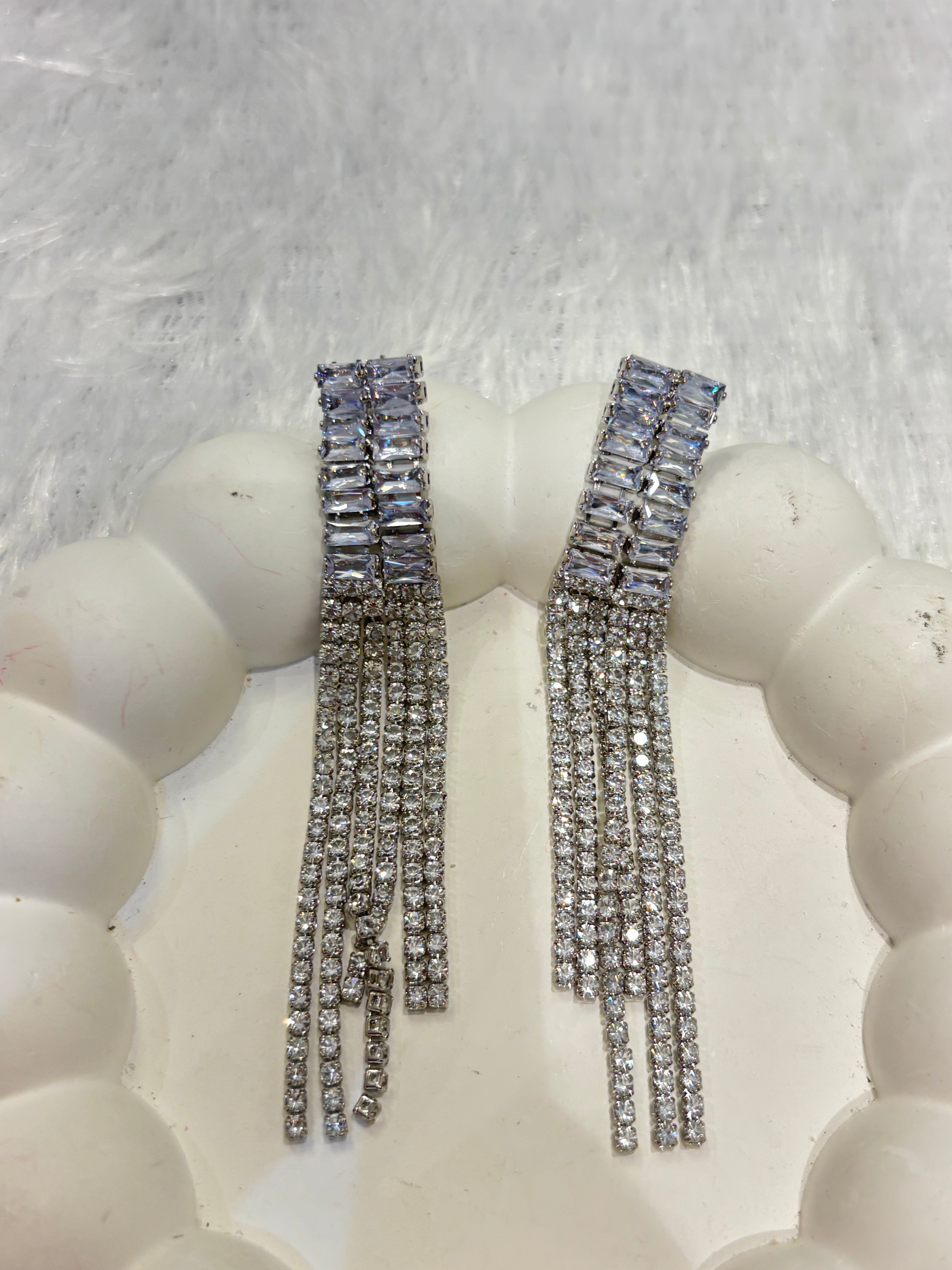 Add instant glamour to your evening look with these stunning Crystal Cascade Long Dangler Earrings, available in both gold plating and silver plating. Designed with layered baguette-cut crystals and delicate rhinestone chains, these earrings flow beautifully to create a dazzling waterfall effect.