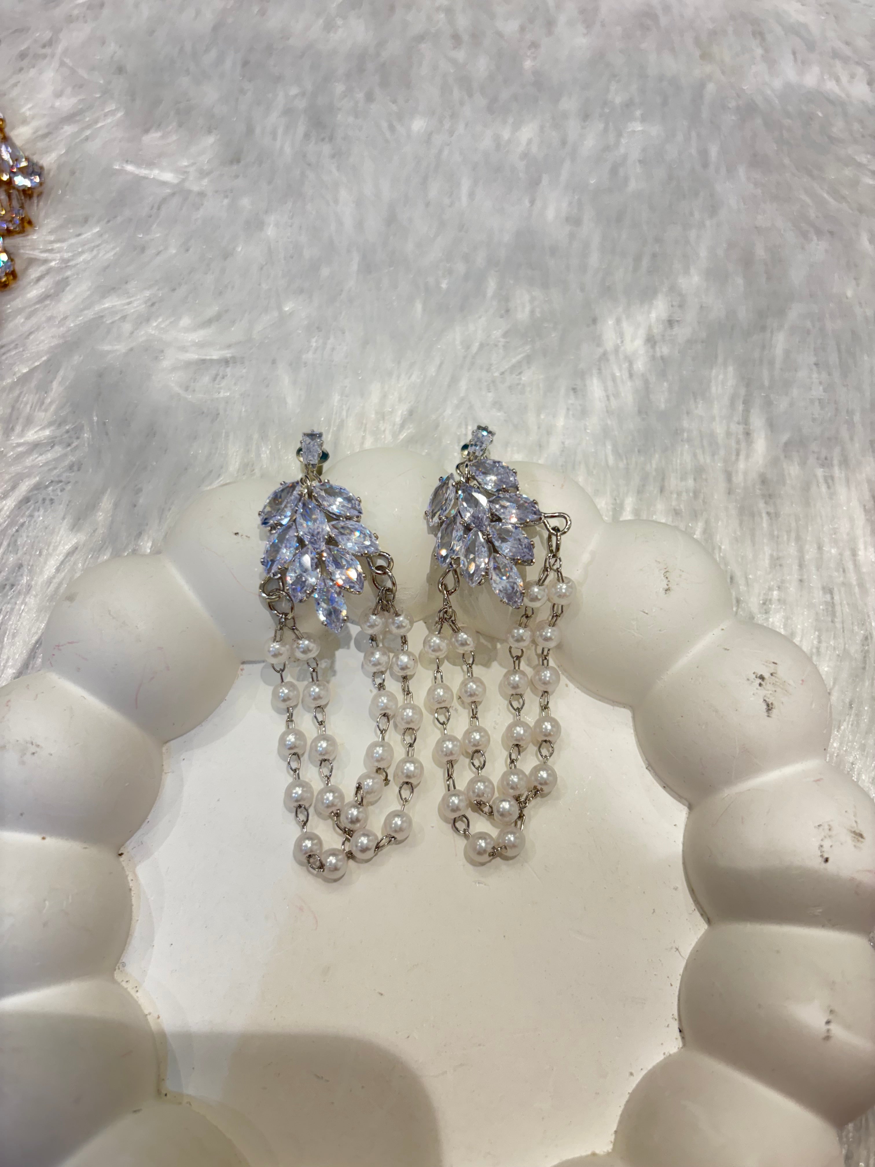 Elegance meets glamour with our Crystal Leaf Pearl Chain Drop Earrings. Designed with sparkling leaf-shaped crystals at the top and cascading pearl chains, these earrings create the perfect blend of classic charm and modern sophistication. Ideal for weddings, festive occasions, and evening parties, this pair adds graceful movement and radiant sparkle to every outfit. A must-have statement accessory for your jewelry collection.