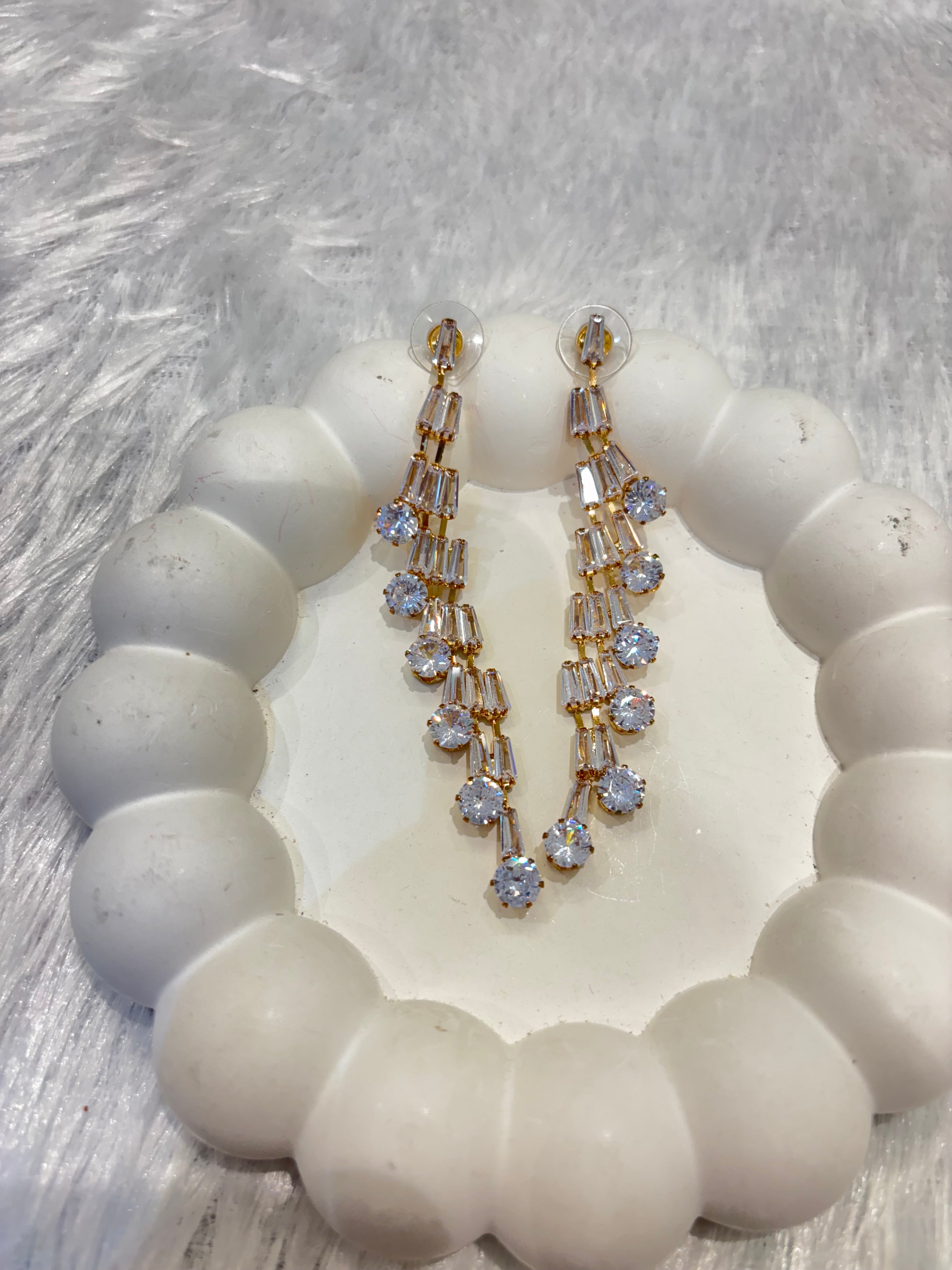 Add a touch of timeless glamour with our Dual Tone Crystal Cascade Drop Earrings. Designed with a combination of sparkling white stones and glossy gold accents, these long earrings bring sophistication and shine to any look. Perfect for weddings, festive wear, or evening parties, their cascading design enhances every outfit with elegance and sparkle. Lightweight yet statement-worthy, they are a must-have addition to your jewelry collection.