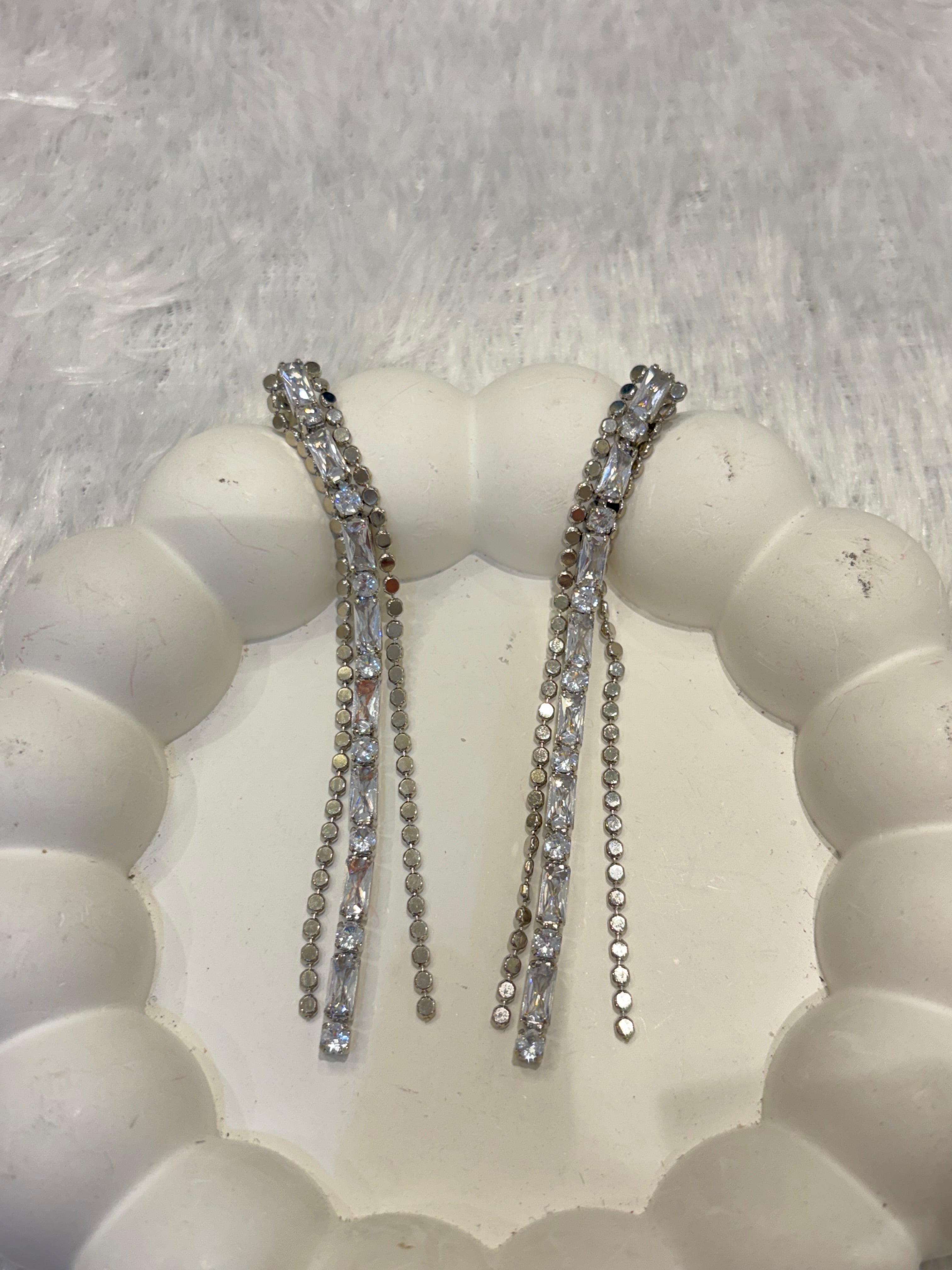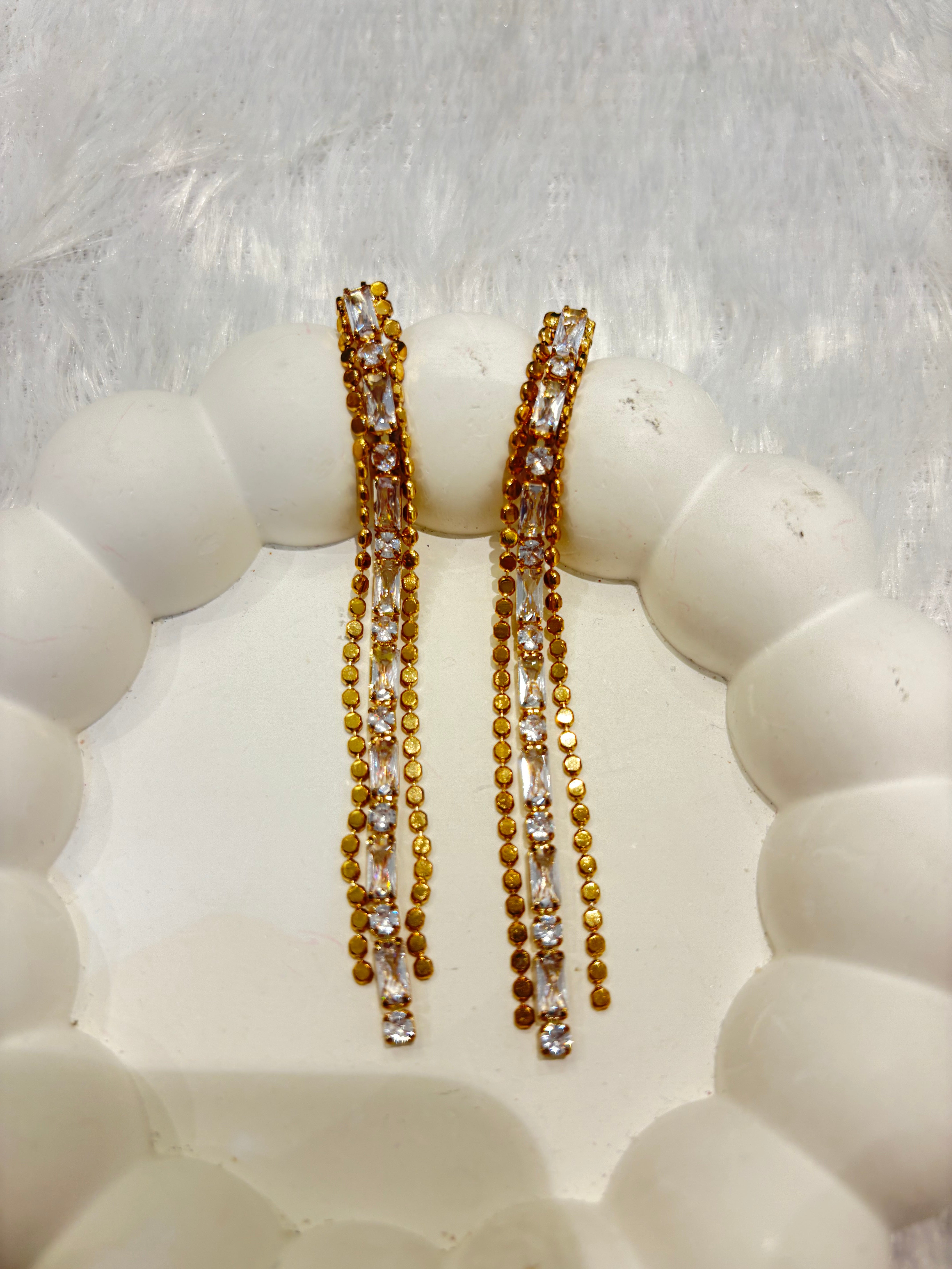 Elevate your party and festive look with these glamorous dual-tone long dangler earrings. Designed with sparkling crystals in both gold and silver finishes, these earrings exude elegance and versatility. The elongated design creates a sleek and modern silhouette, making them the perfect accessory for weddings, cocktail parties, festive occasions, and evening wear. Lightweight yet statement-worthy, they add the right amount of sparkle to any outfit.