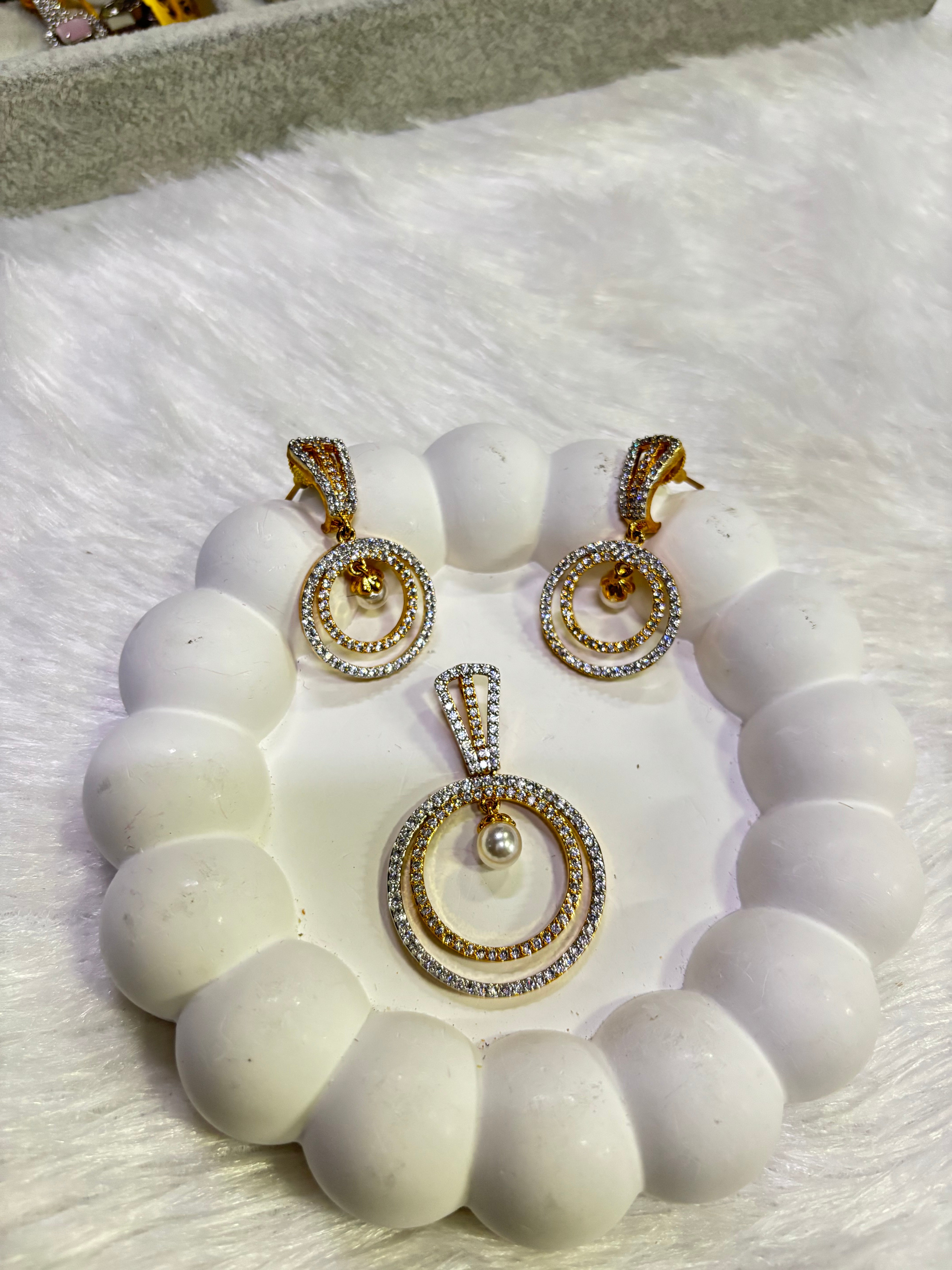 Add a touch of sophistication to your collection with this dual circle jewelry set, featuring a dazzling pendant and earrings. Crafted in a gold finish with cubic zirconia (CZ) stones, the design is elevated with a delicate pearl drop for timeless elegance.