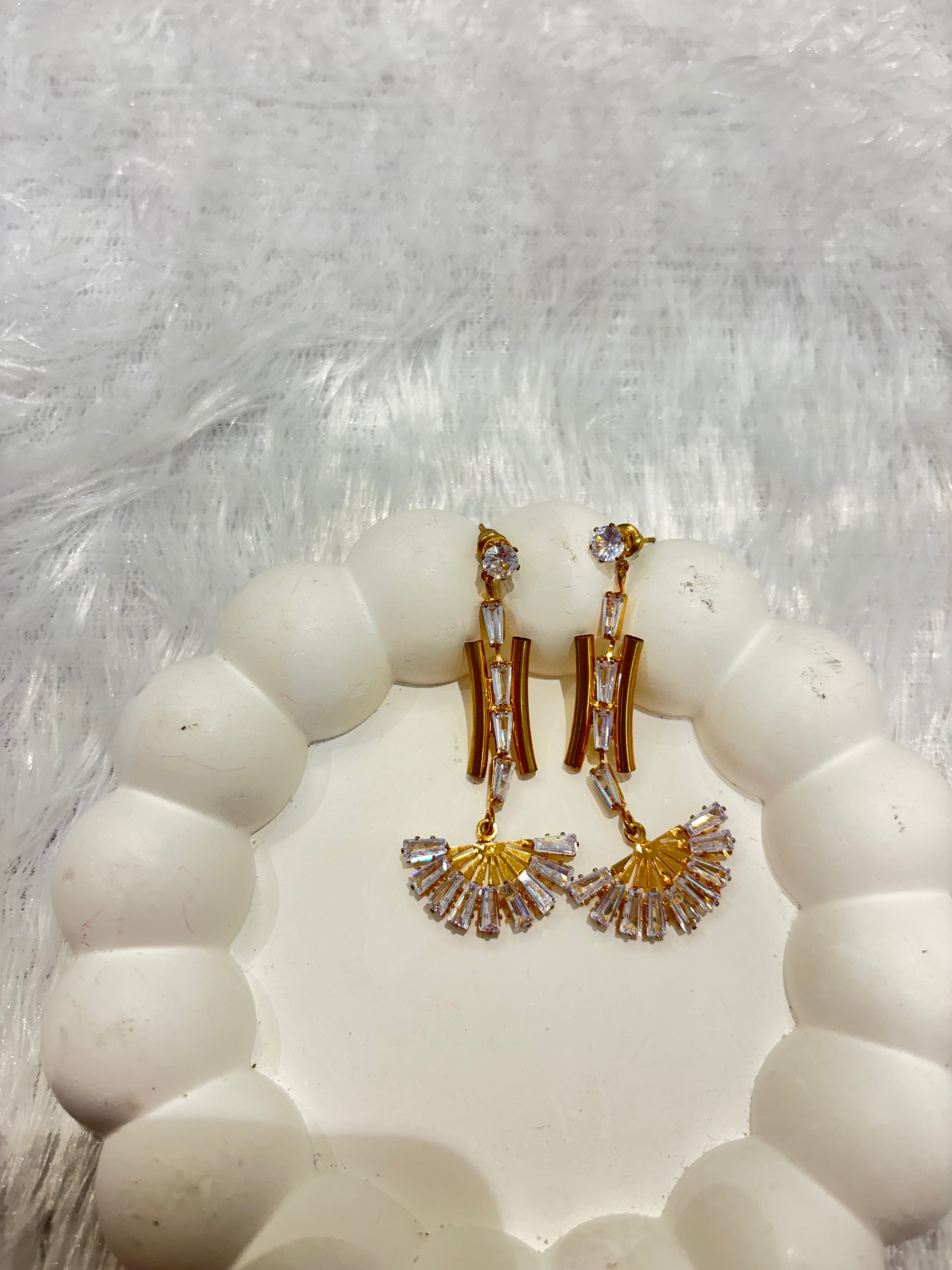 Add a graceful flair to your style with these fan-shaped crystal drop earrings. Featuring a shimmering arrangement of baguette-cut crystals set in a unique fan design, these earrings bring together traditional charm and modern elegance. Perfect for weddings, parties, or evening outings, their sparkling finish makes them a statement piece for any outfit. Lightweight and comfortable, they are crafted to keep you looking chic all day long.