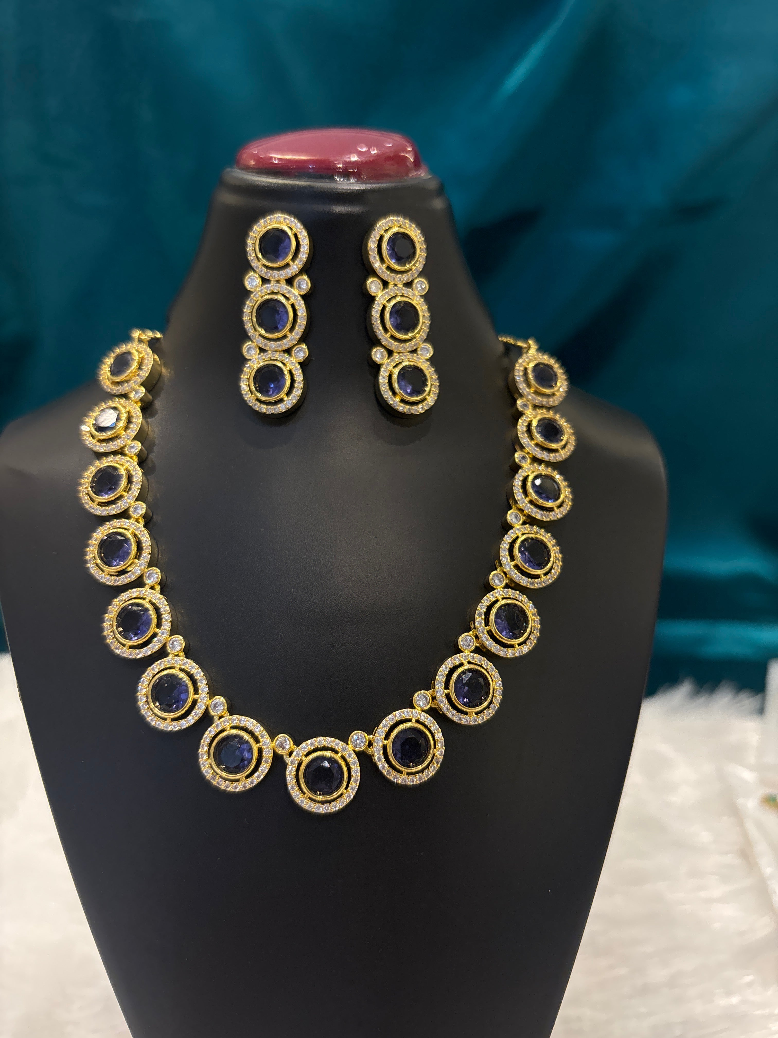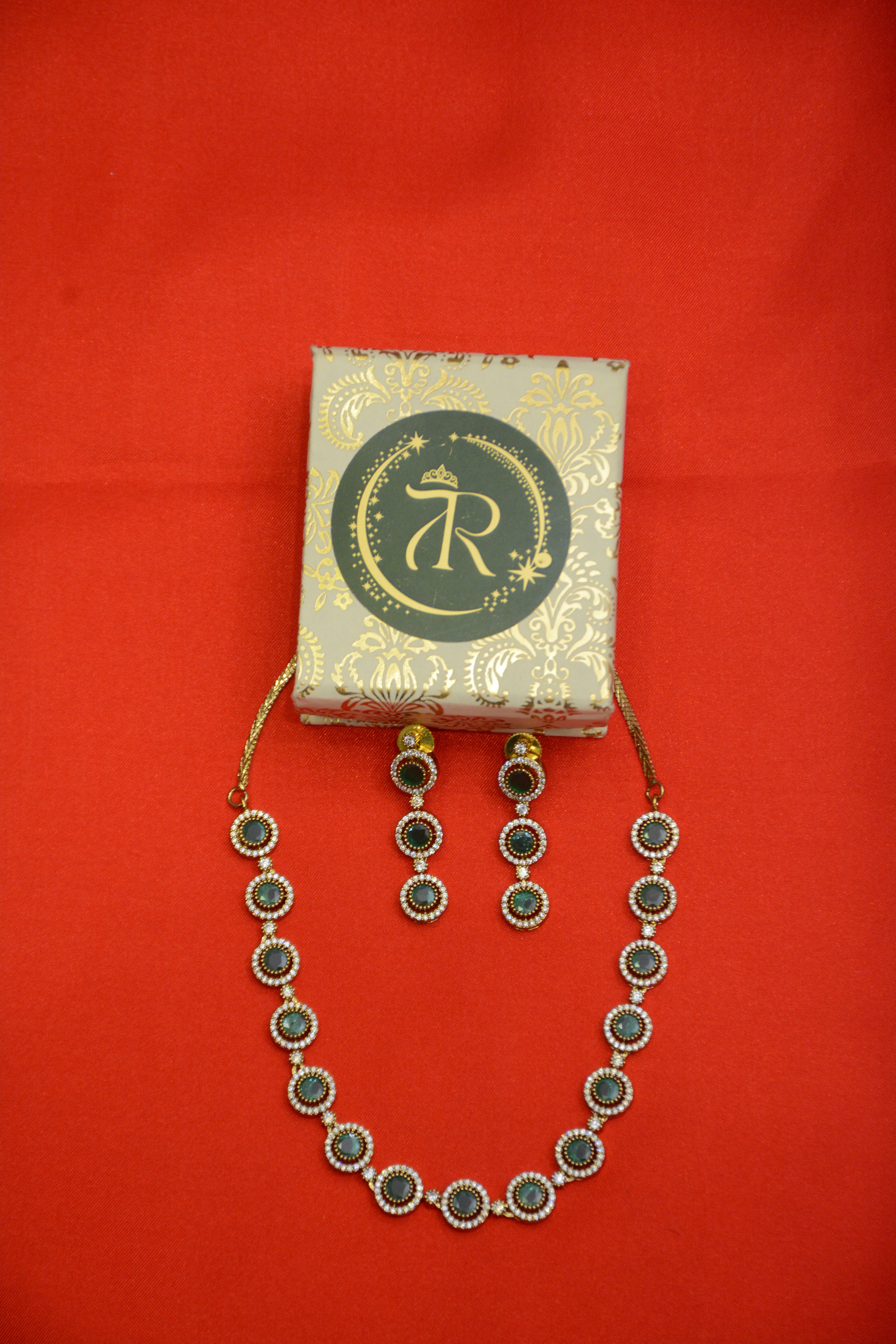 Add vintage elegance to your collection with this circular shaped mehendi necklace set, featuring radiant stones in a timeless round design. Finished in antique mehendi polish, the set includes a beautifully crafted necklace with matching earrings, perfect for weddings, festivals, poojas, and cultural occasions.
