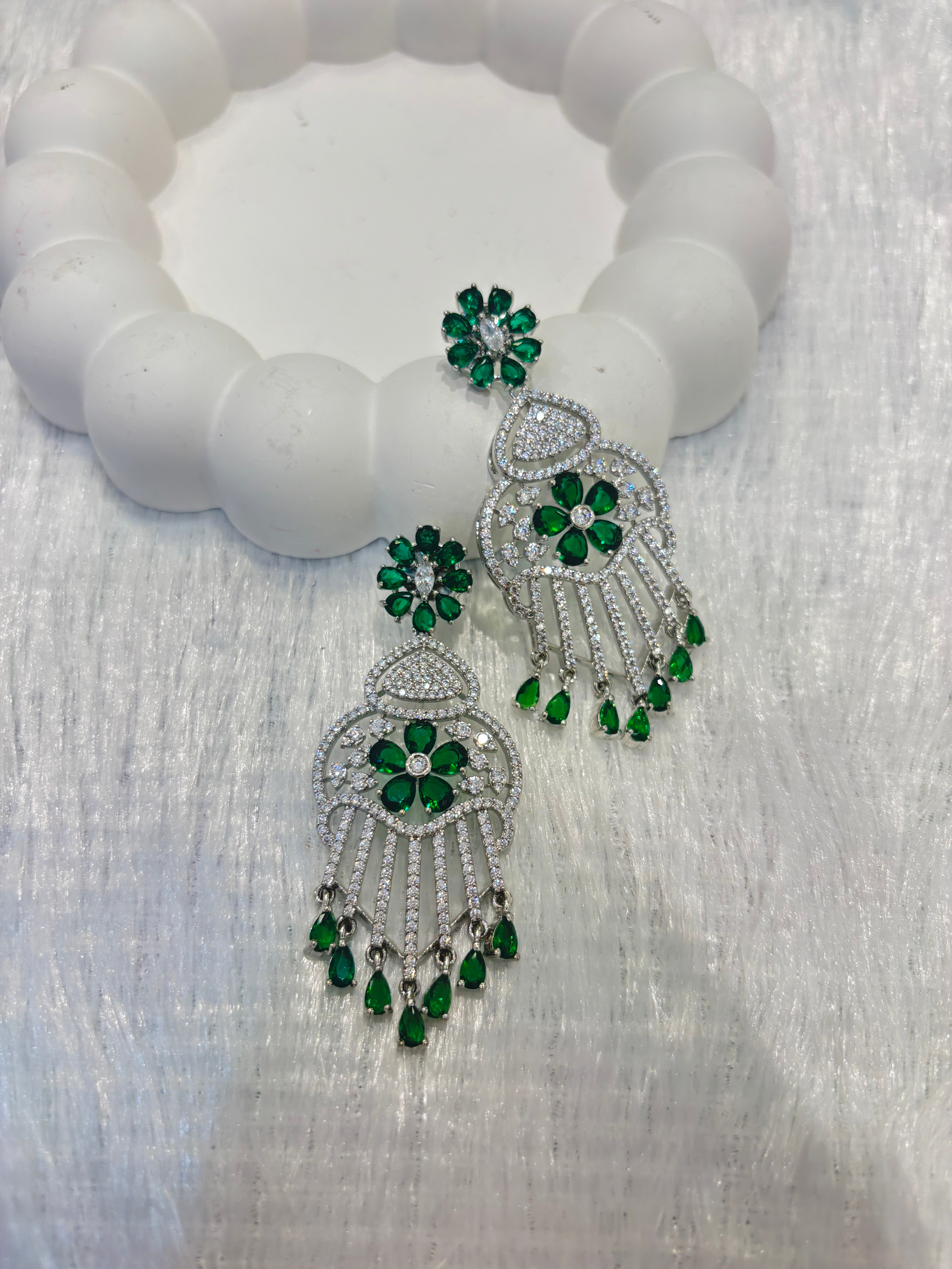 Make a bold yet elegant statement with these emerald green floral tassel dangler earrings, featuring dazzling cubic zirconia (CZ) diamonds set in intricate circular patterns. The earrings showcase vibrant emerald floral motifs, finished with cascading teardrop emerald tassels that add graceful movement and charm.