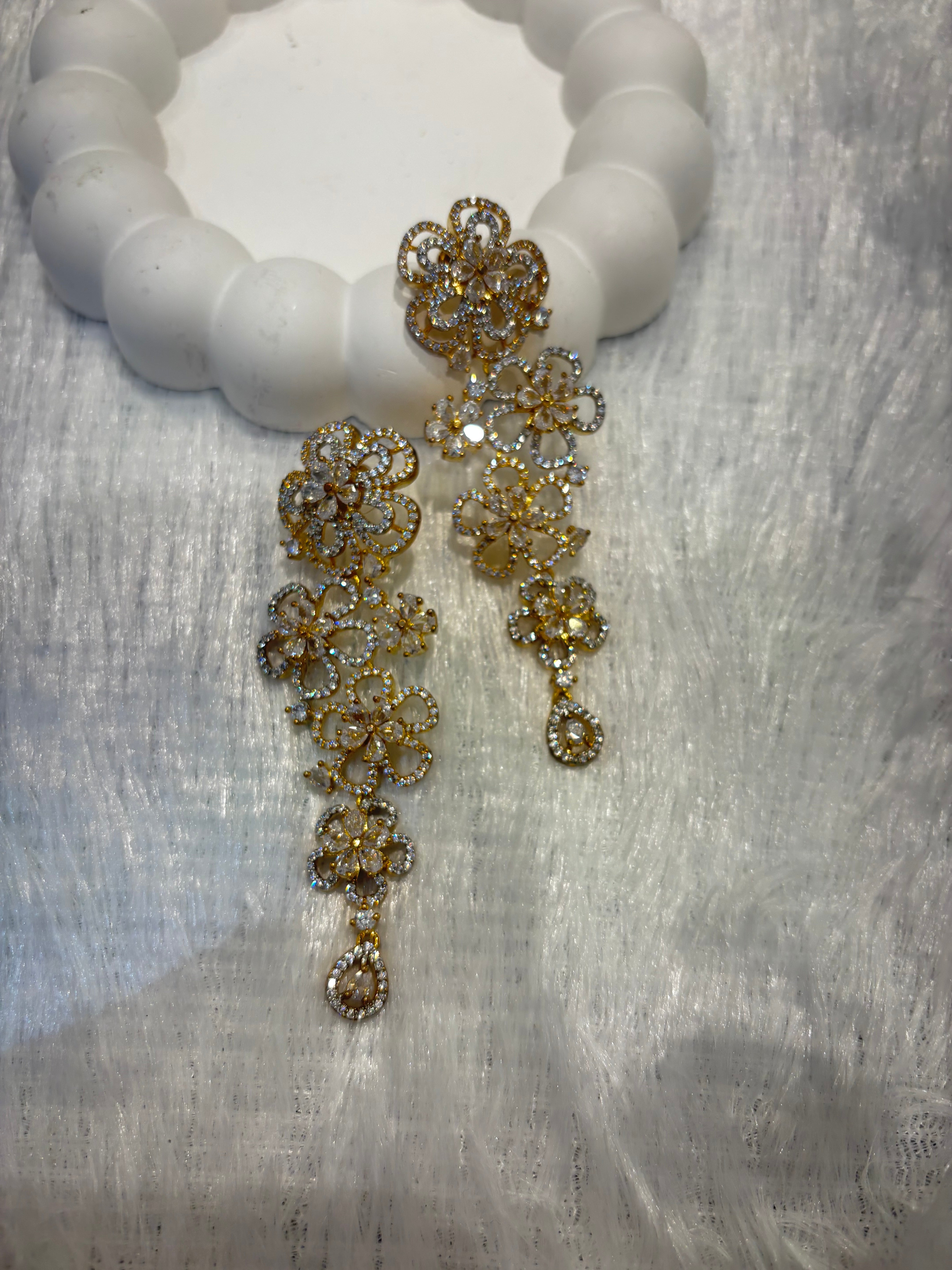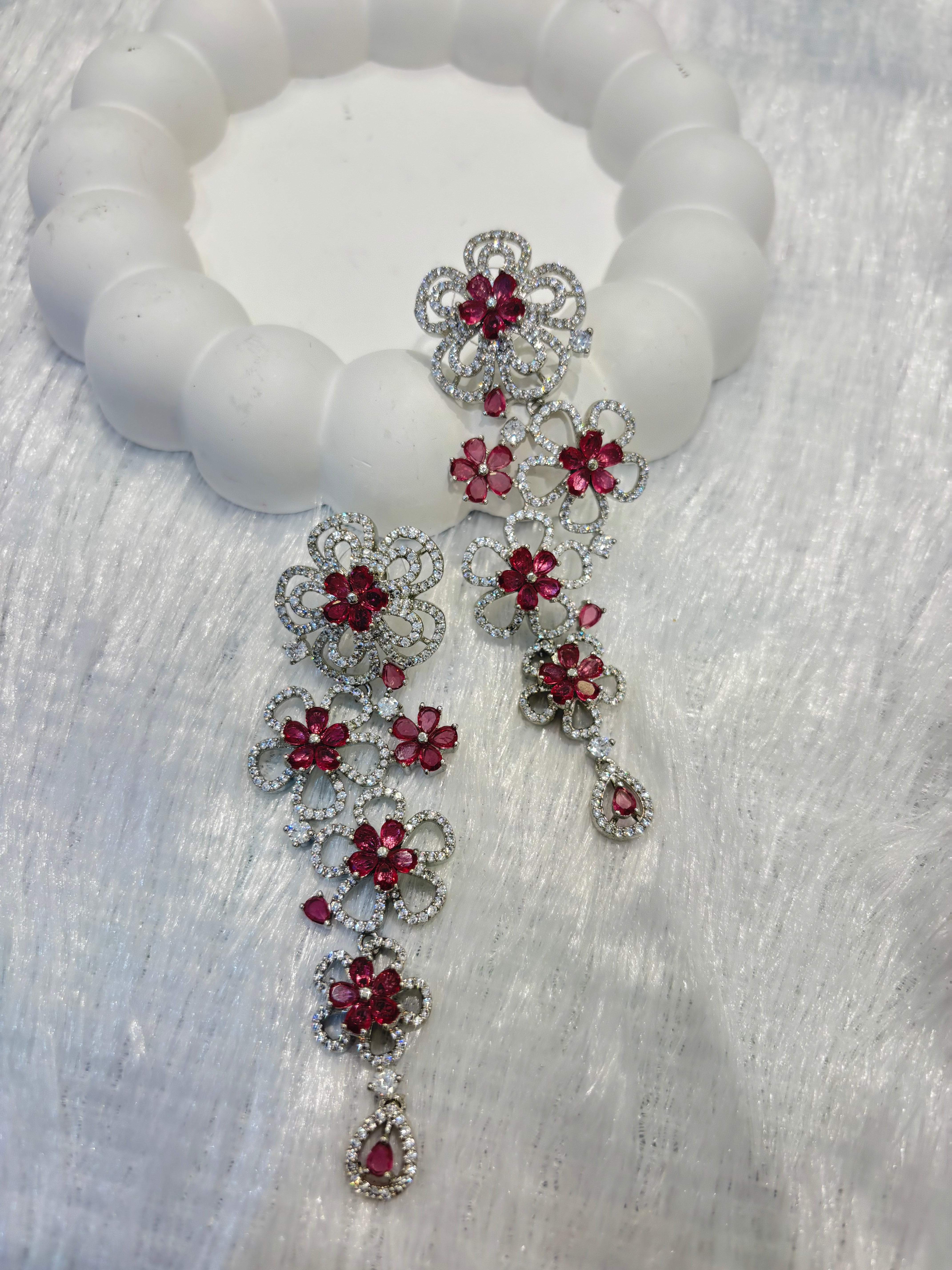 Add a touch of blooming elegance with these Floral Cascade Dangler Earrings, available in three enchanting shades — emerald green, ruby pink, and classic golden. Each earring is designed with delicate floral motifs encrusted with cubic zirconia (CZ) diamonds, cascading beautifully into a teardrop stone dangler for a graceful finish.