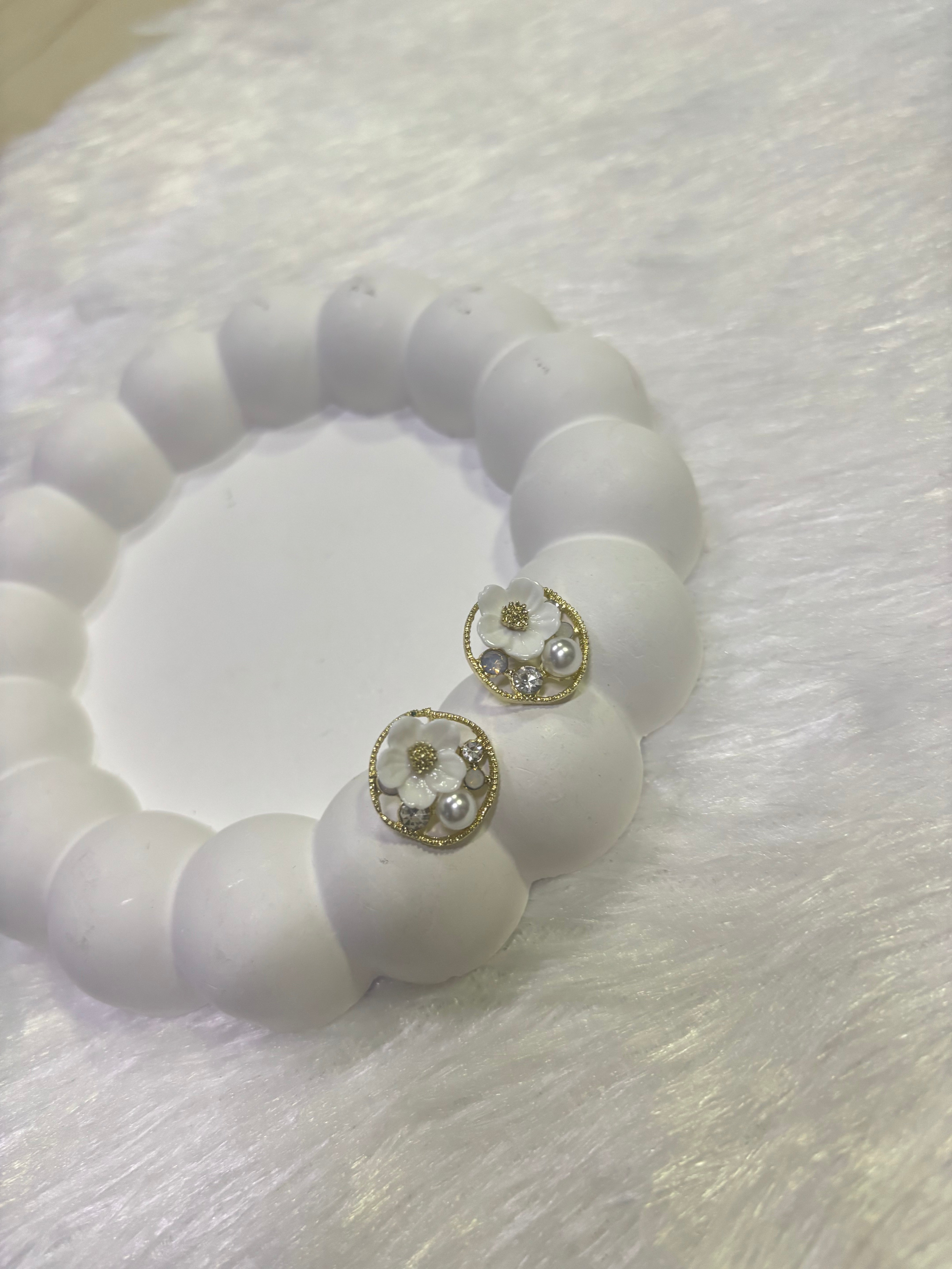 Delicate yet elegant, these floral stud earrings are designed with a charming white flower at the center, surrounded by shimmering crystals and pearls. Set in a golden circular frame, they blend sophistication with a touch of playfulness. Perfect for daily wear, office chic, or festive gatherings, these earrings effortlessly elevate any outfit with their graceful charm.