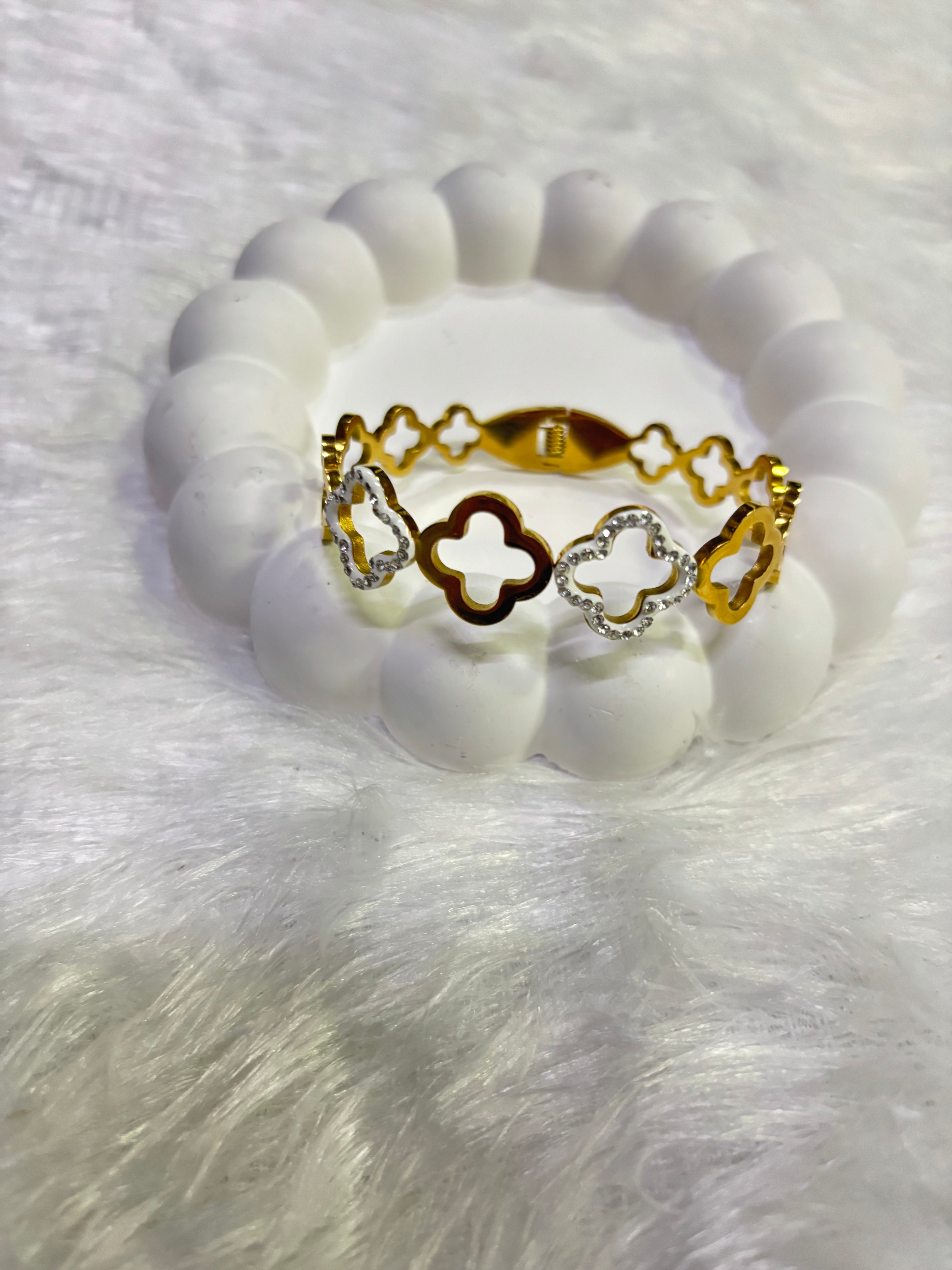 The clover-inspired pattern symbolizes good fortune and positivity, while the sparkling stones add a touch of glamour. Comfortable to wear with a secure clasp, this kada is ideal for pairing with ethnic outfits, fusion styles, or even modern evening wear. A thoughtful piece for gifting and personal style.