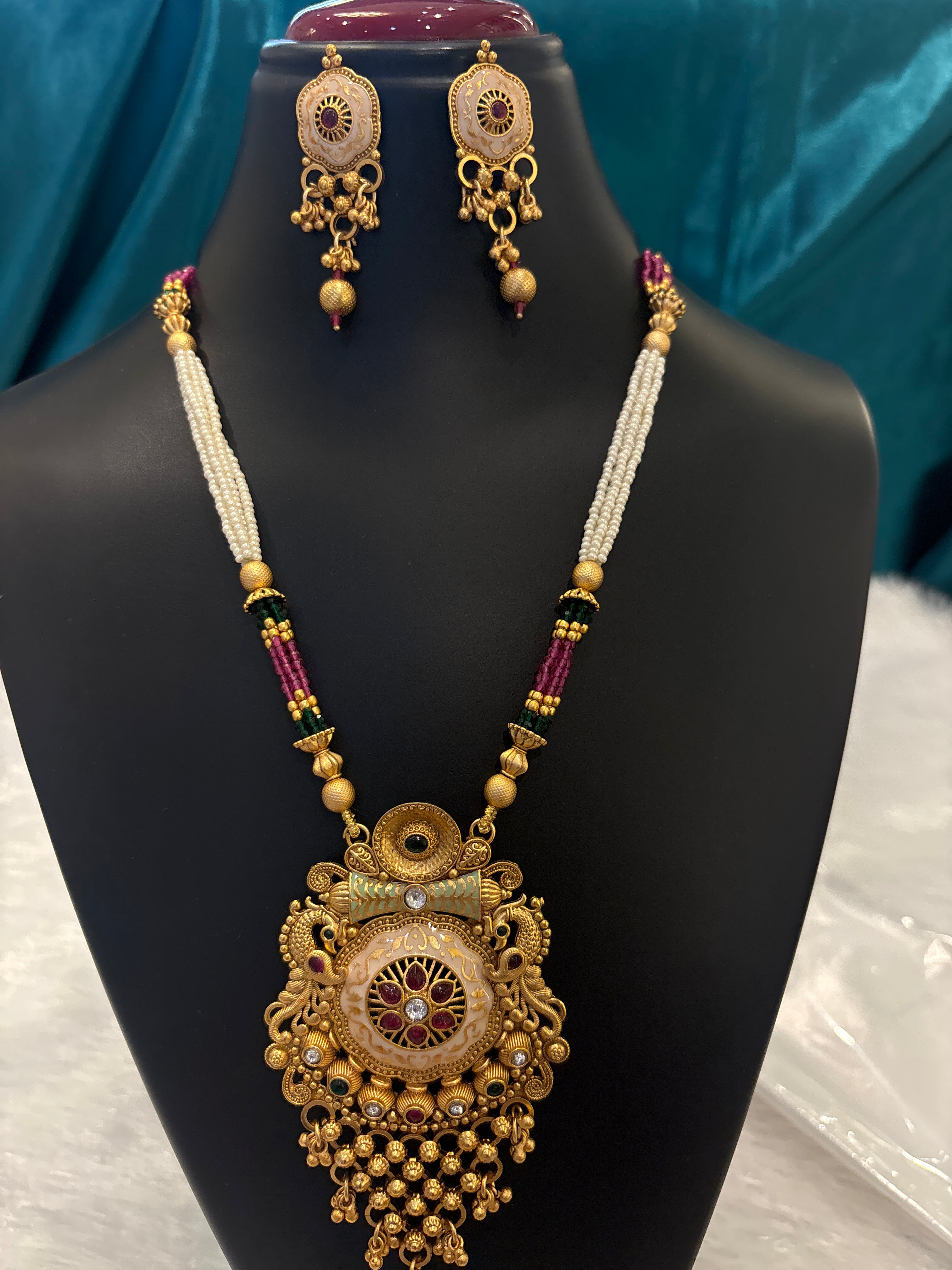 Add a touch of royalty to your ensemble with this Gold Plated and Pearl Rajwadi Maala Set, featuring lustrous pearls and intricate gold-plated craftsmanship. Inspired by traditional Rajwadi designs, this maala set exudes elegance and grandeur, making it perfect for weddings, festivals, and special occasions. The set includes a beautifully designed necklace with matching earrings, offering a complete regal look. Lightweight yet striking, it’s an ideal choice for gifting or elevating your own jewelry collection.