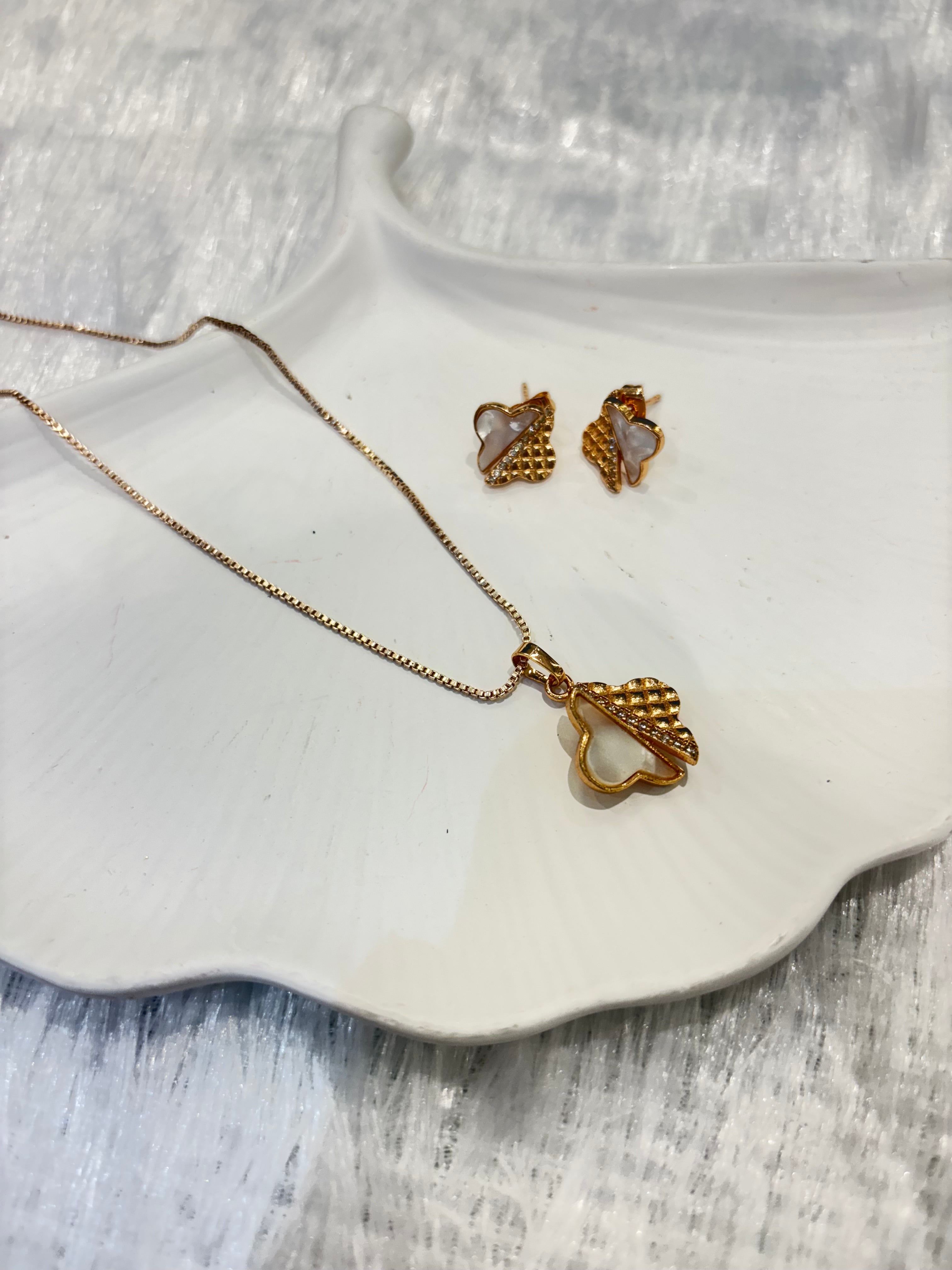 Add a touch of everyday elegance with this Gold Plated Pendant Necklace Set, featuring a delicate heart-leaf inspired pendant paired with matching stud earrings. Designed with a mix of textured gold plating and a soft pearly inlay, this set beautifully balances minimal charm with modern sophistication.
