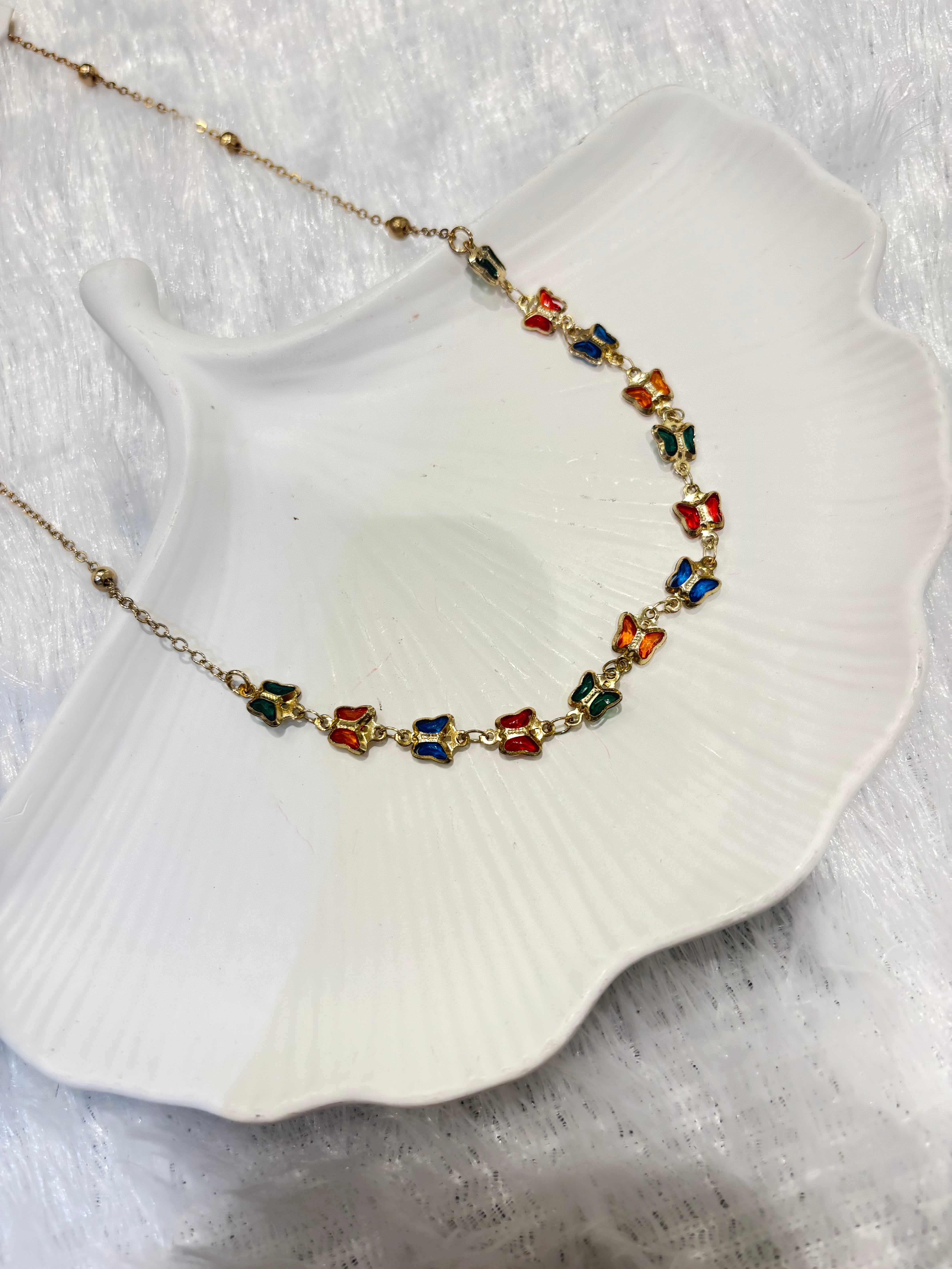 Bring a playful charm to your look with this Gold Plated Butterfly Necklace, designed with delicate enamel multicolor butterfly motifs in vibrant shades of red, blue, green, and orange. Each butterfly is finely detailed, creating a joyful and trendy piece that adds a pop of color to any outfit.