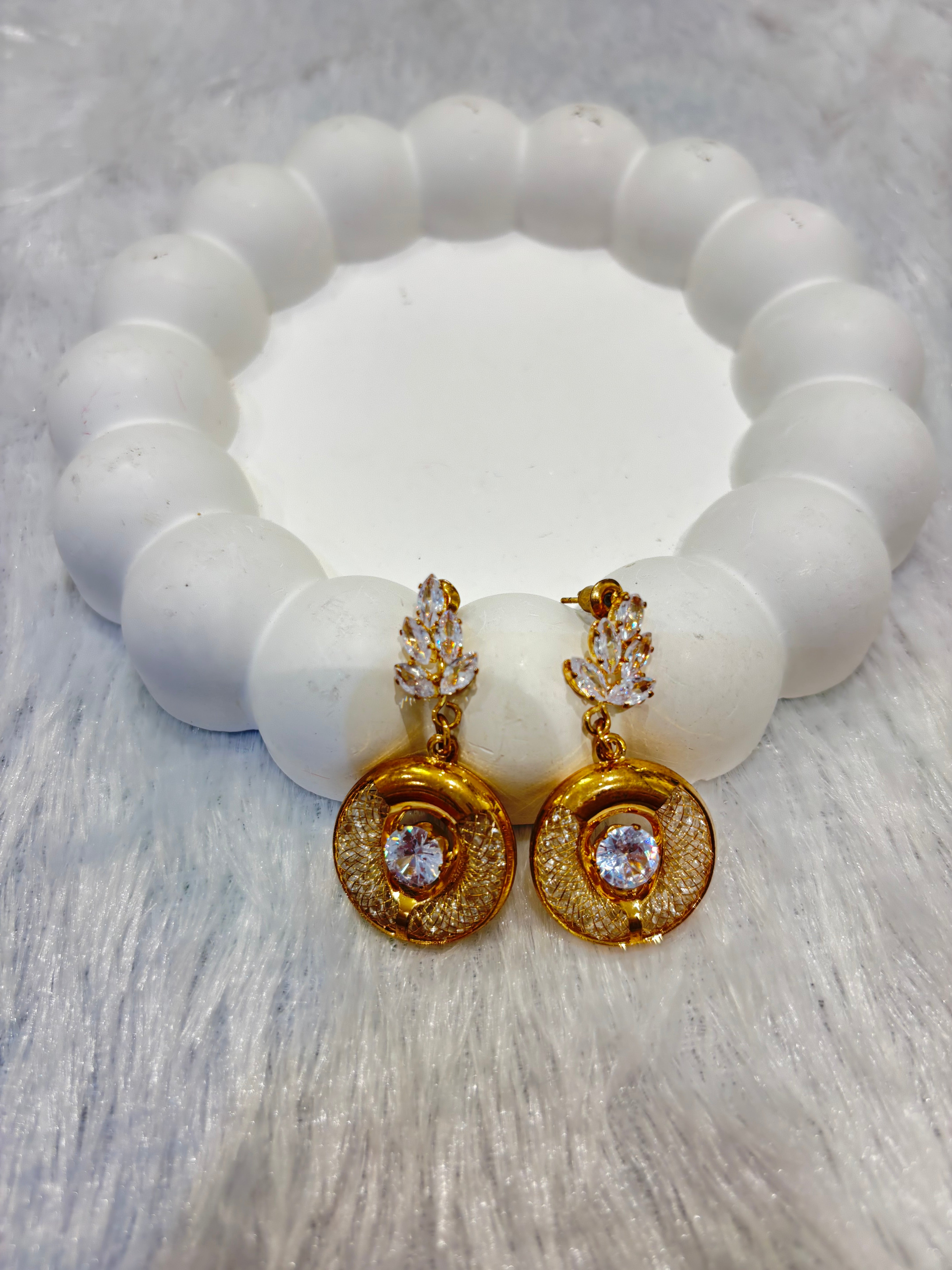 Shine bright with these Gold Round Crystal Drop Earrings, featuring a dazzling circular design with a sparkling central stone and zircon-studded detailing. The elegant leaf-shaped top adds a refined touch, making them perfect for parties, weddings, and festive occasions. Lightweight yet eye-catching, these earrings pair beautifully with both Indian and Western outfits, ensuring you stand out in every celebration.