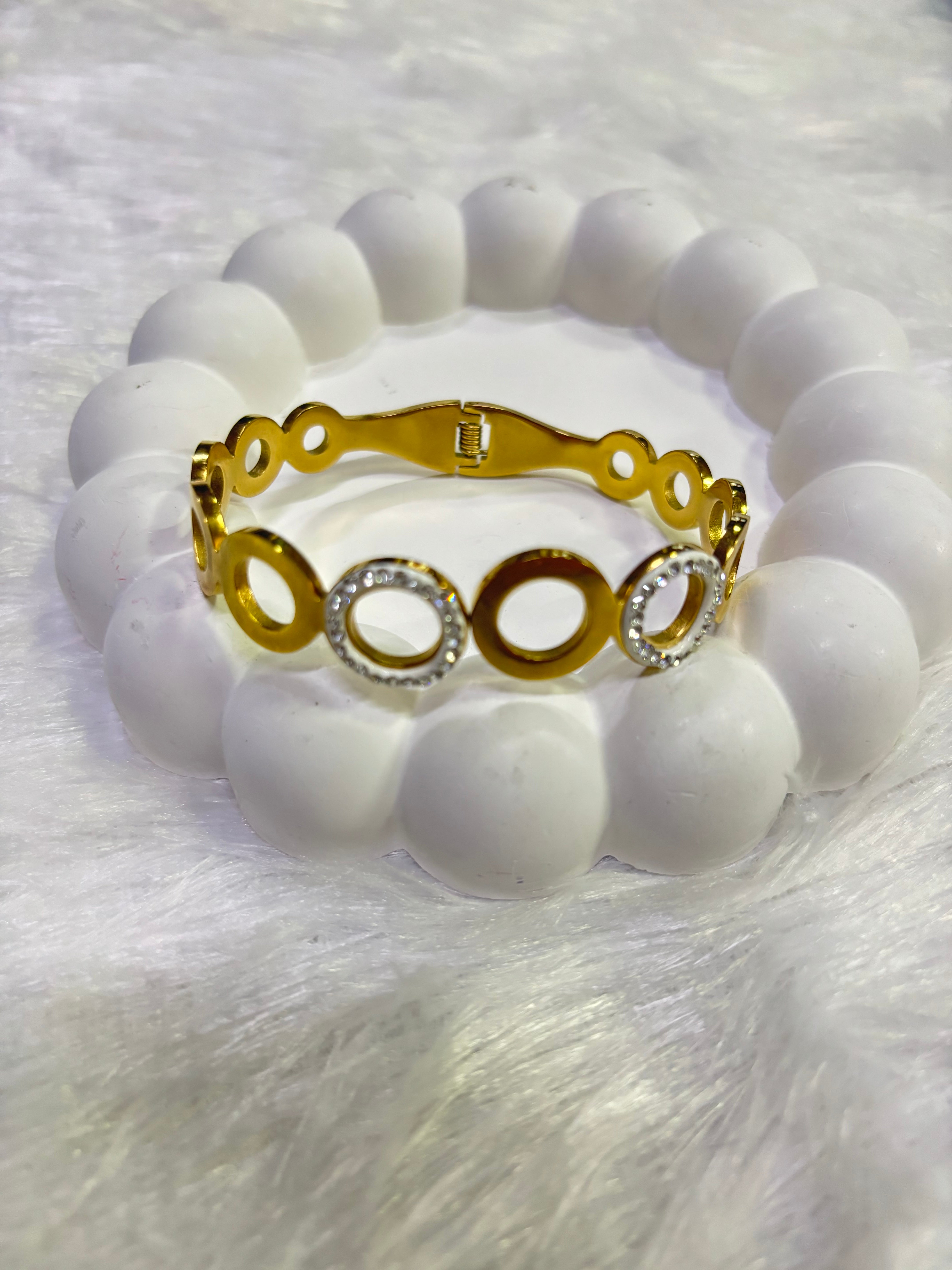 Make a bold yet elegant statement with this golden open circle kada bangle, designed with alternating circular cut-outs and sparkling stone-studded accents. Its unique contemporary pattern makes it a perfect accessory for parties, festive occasions, and weddings.
