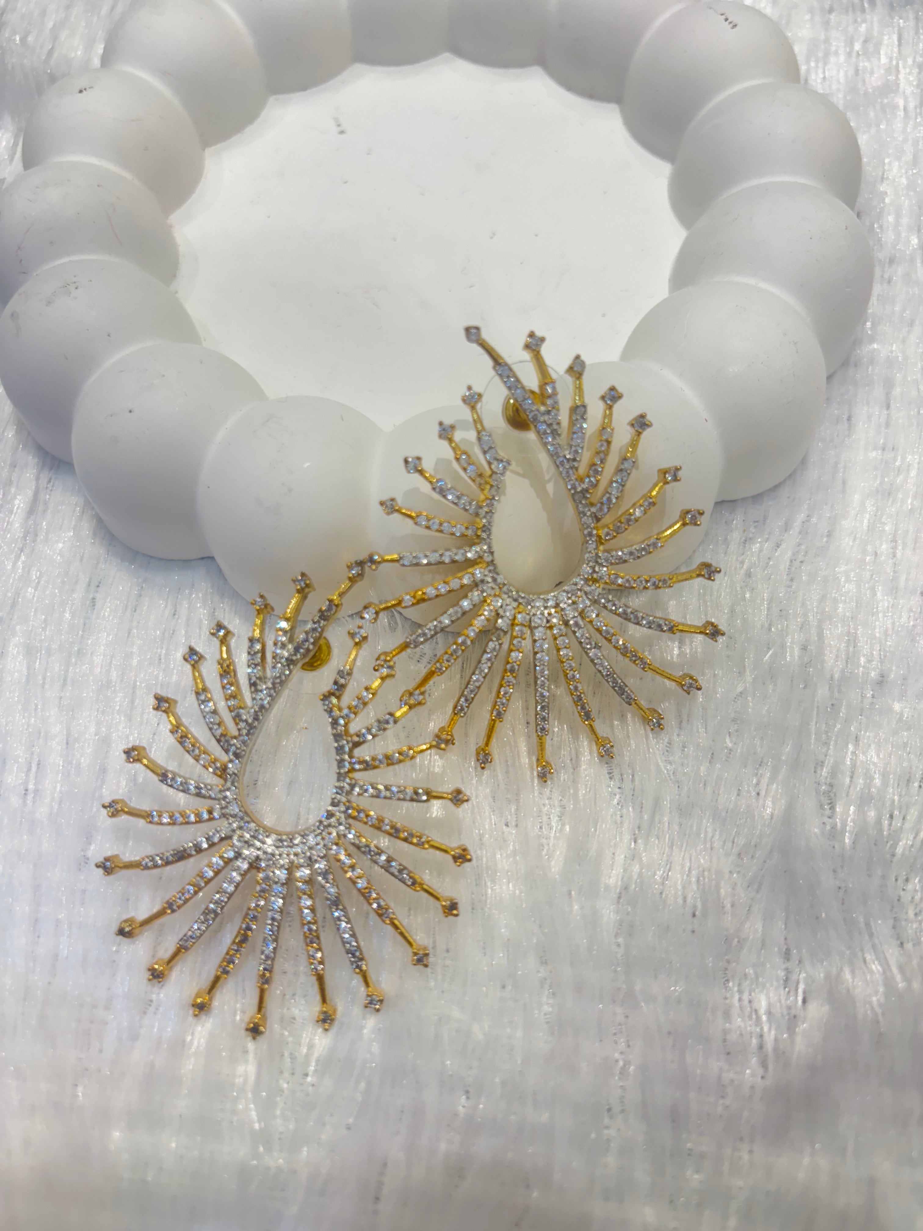 Shine like the sun with these radiant golden sunburst statement earrings, designed with dazzling cubic zirconia (CZ) diamonds set in a bold open-teardrop silhouette. The unique sun-inspired design spreads outward in sparkling golden rays, making them a true statement piece for any occasion.