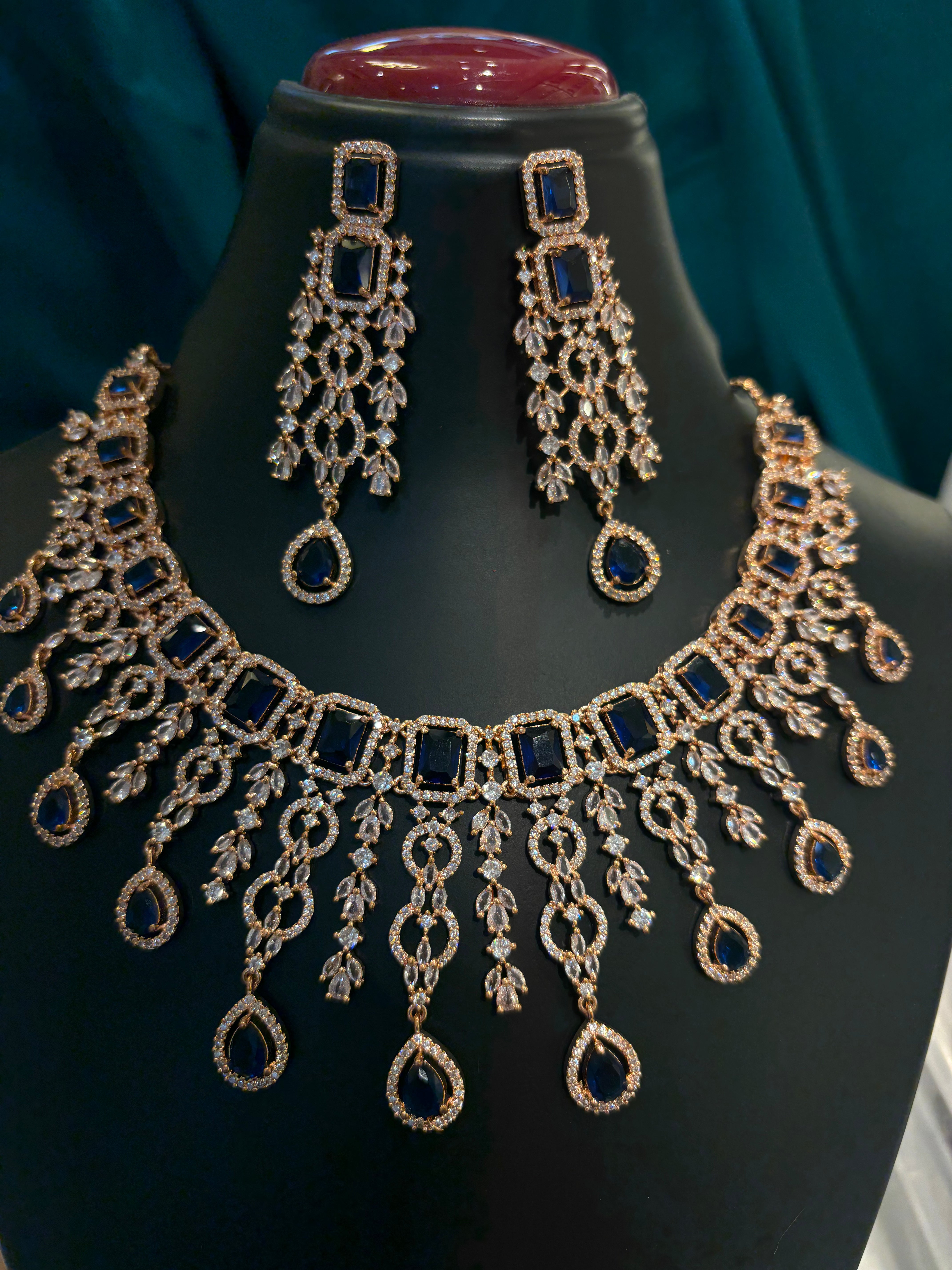 Elevate your bridal or festive look with this heavy rose gold plated haar with blue stone, featuring bold and luxurious craftsmanship. The deep blue stones set against a rich rose gold base create a regal contrast, perfect for weddings, receptions, and grand celebrations.