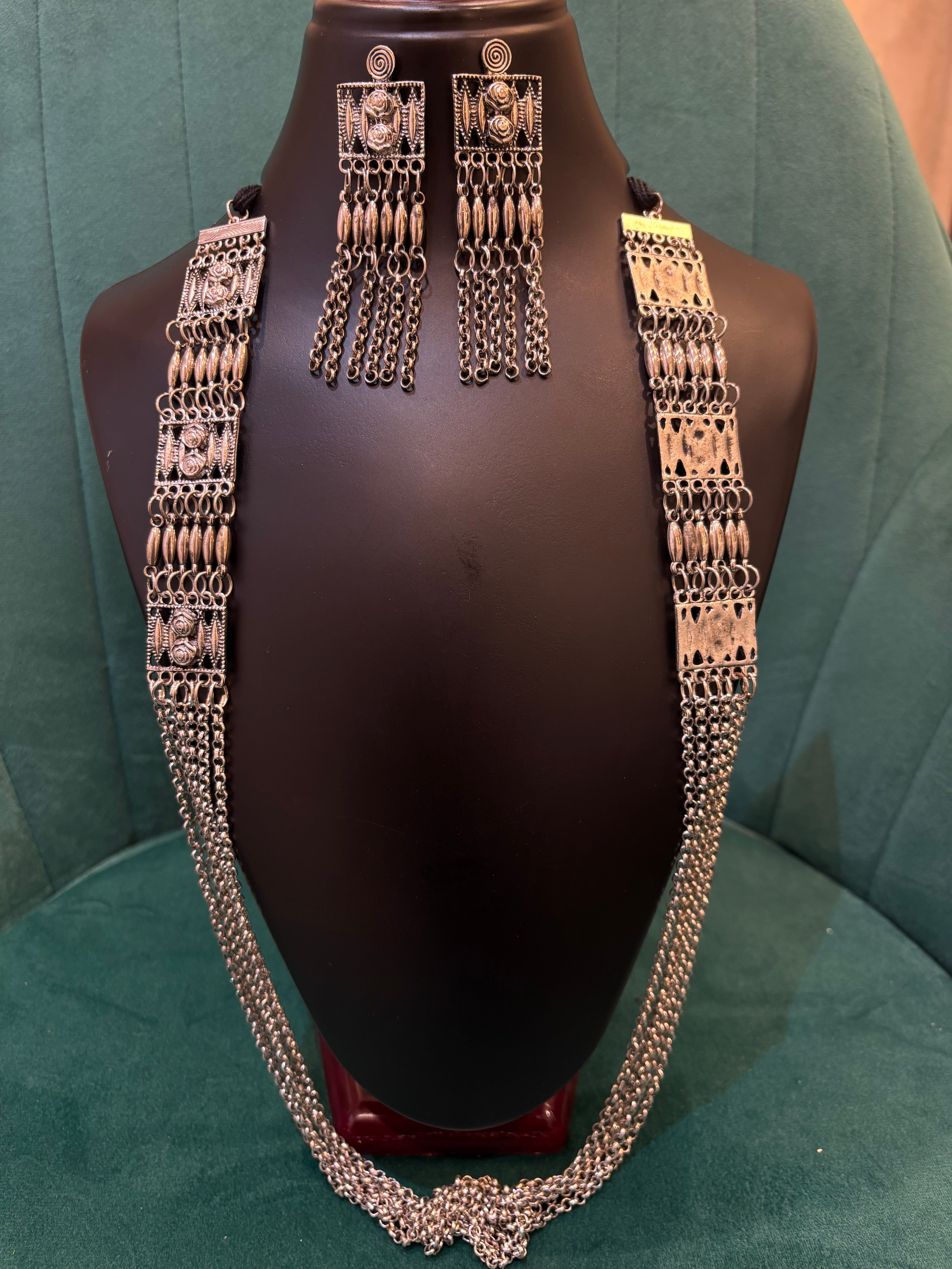 Enhance your style with this Long Oxidized Chains & Panel Necklace Set, featuring intricate square panels and cascading chain danglings. The antique oxidized silver finish paired with bold earrings makes this a statement jewelry set for women who love traditional elegance with a modern edge.