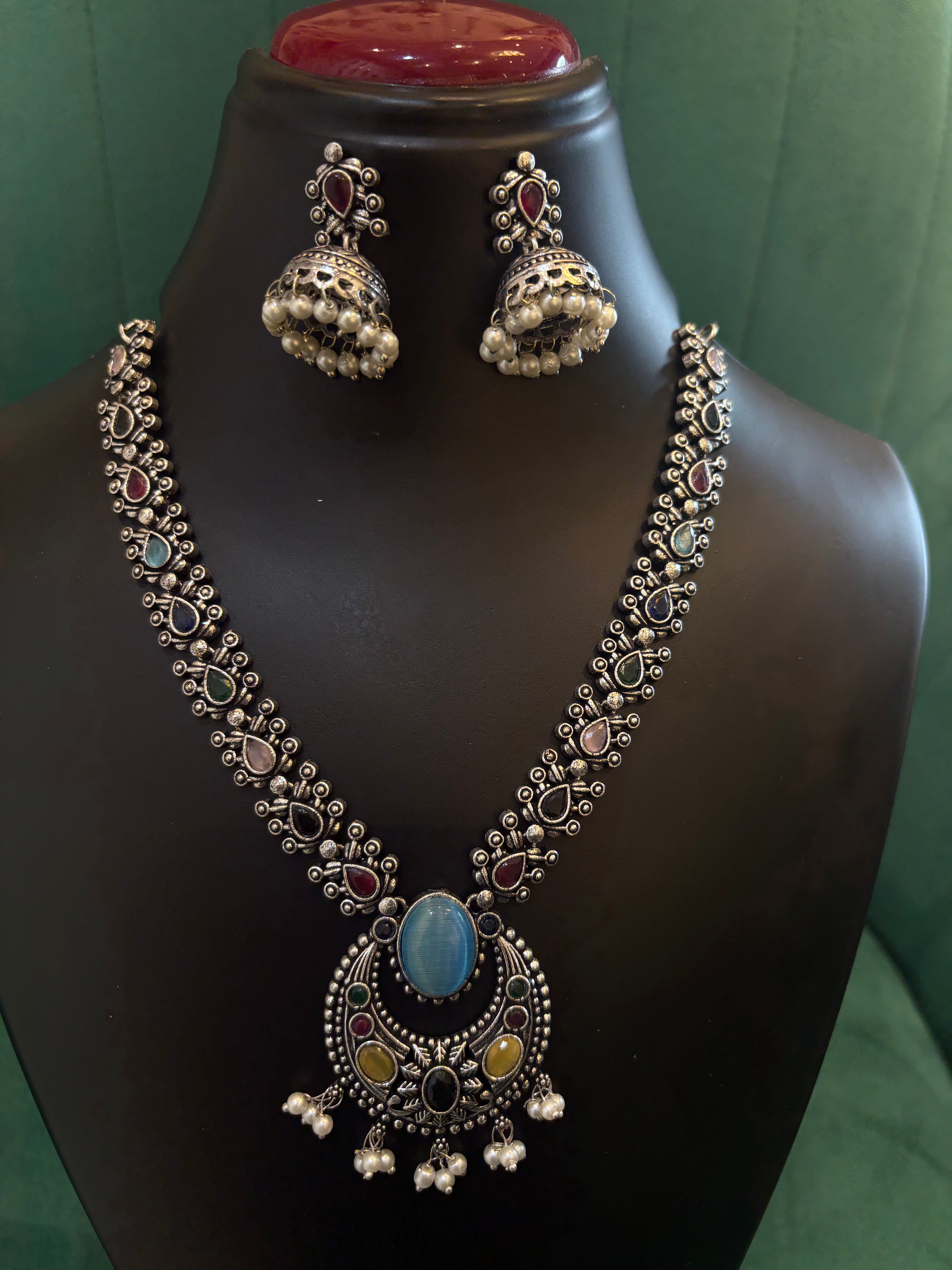 Add a vibrant twist to your ethnic style with this Multicoloured Stones & Oxidized Jewelry Set. Featuring oxidized silver craftsmanship adorned with colorful stones, this piece blends the boldness of antique designs with the playfulness of multicolour detailing.