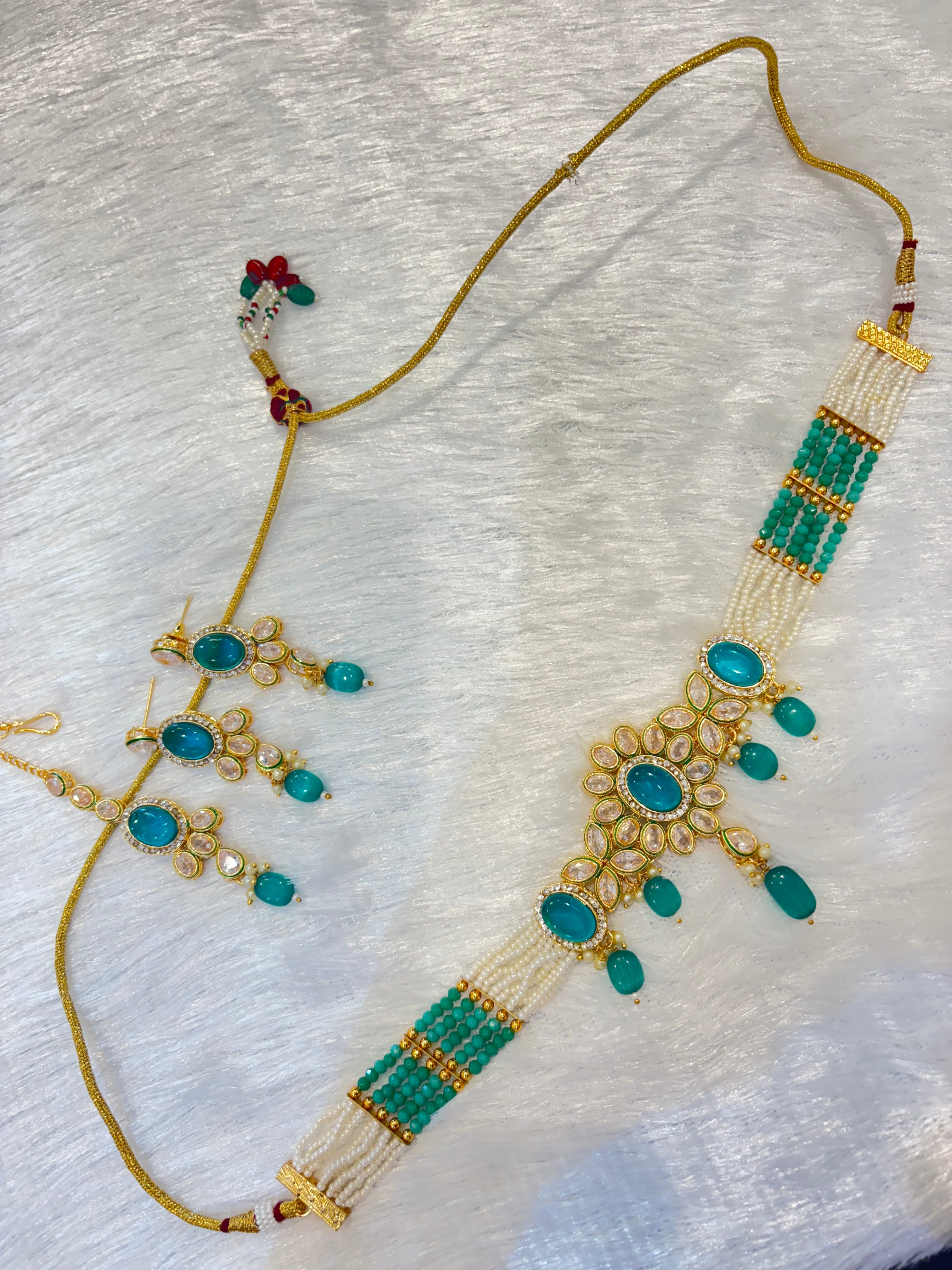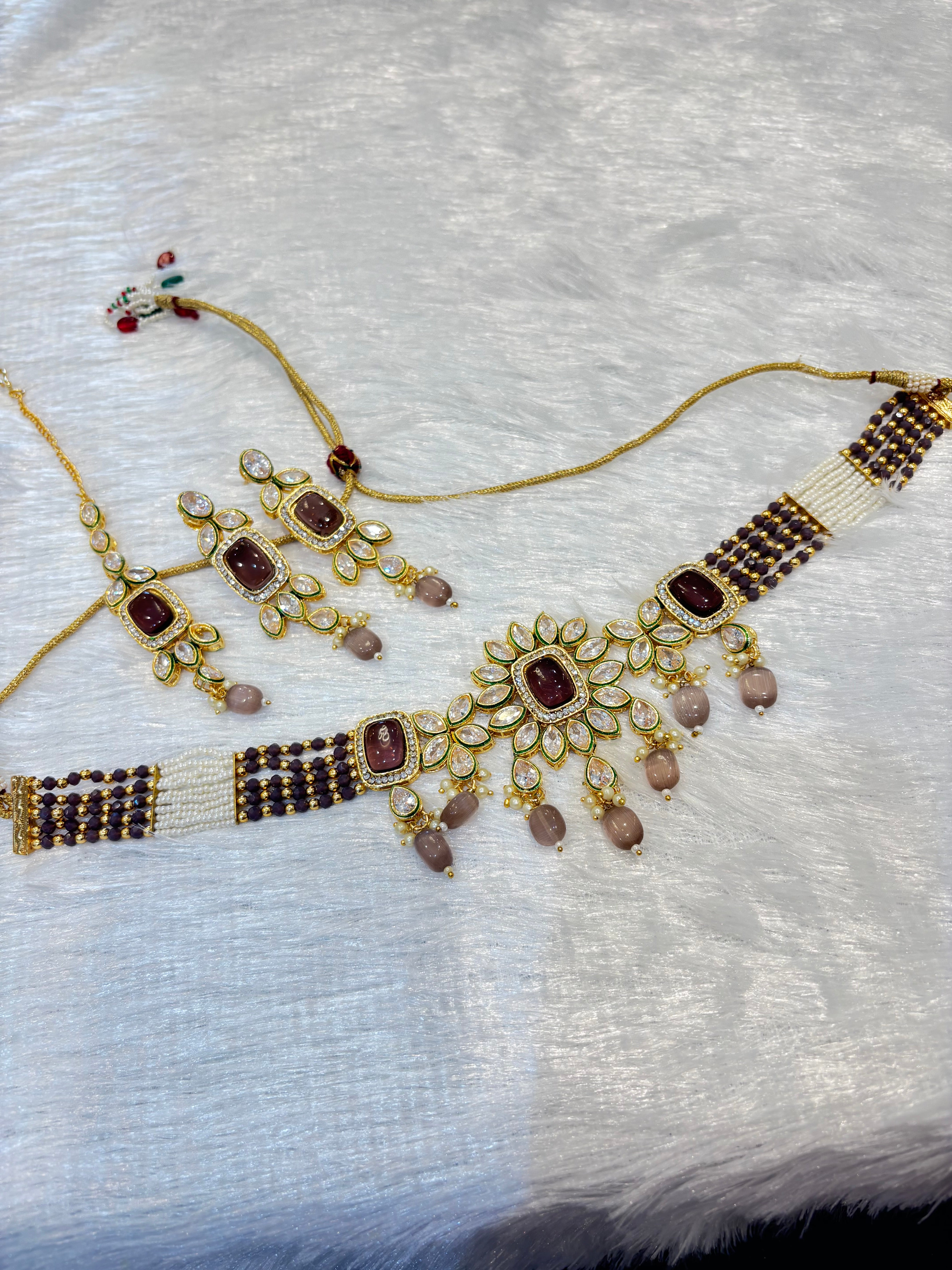 Elevate your traditional style with this Pearl and Kundan Choker Set, a stunning fusion of classic elegance and regal charm. Featuring lustrous pearls paired with sparkling Kundan stones, this choker exudes sophistication, making it perfect for weddings, festive occasions, and cultural celebrations. The intricate craftsmanship and balanced design create a timeless piece that complements both traditional sarees and modern lehengas. Complete with matching earrings, it’s the perfect choice for brides and jewelry lovers seeking refined glamour.