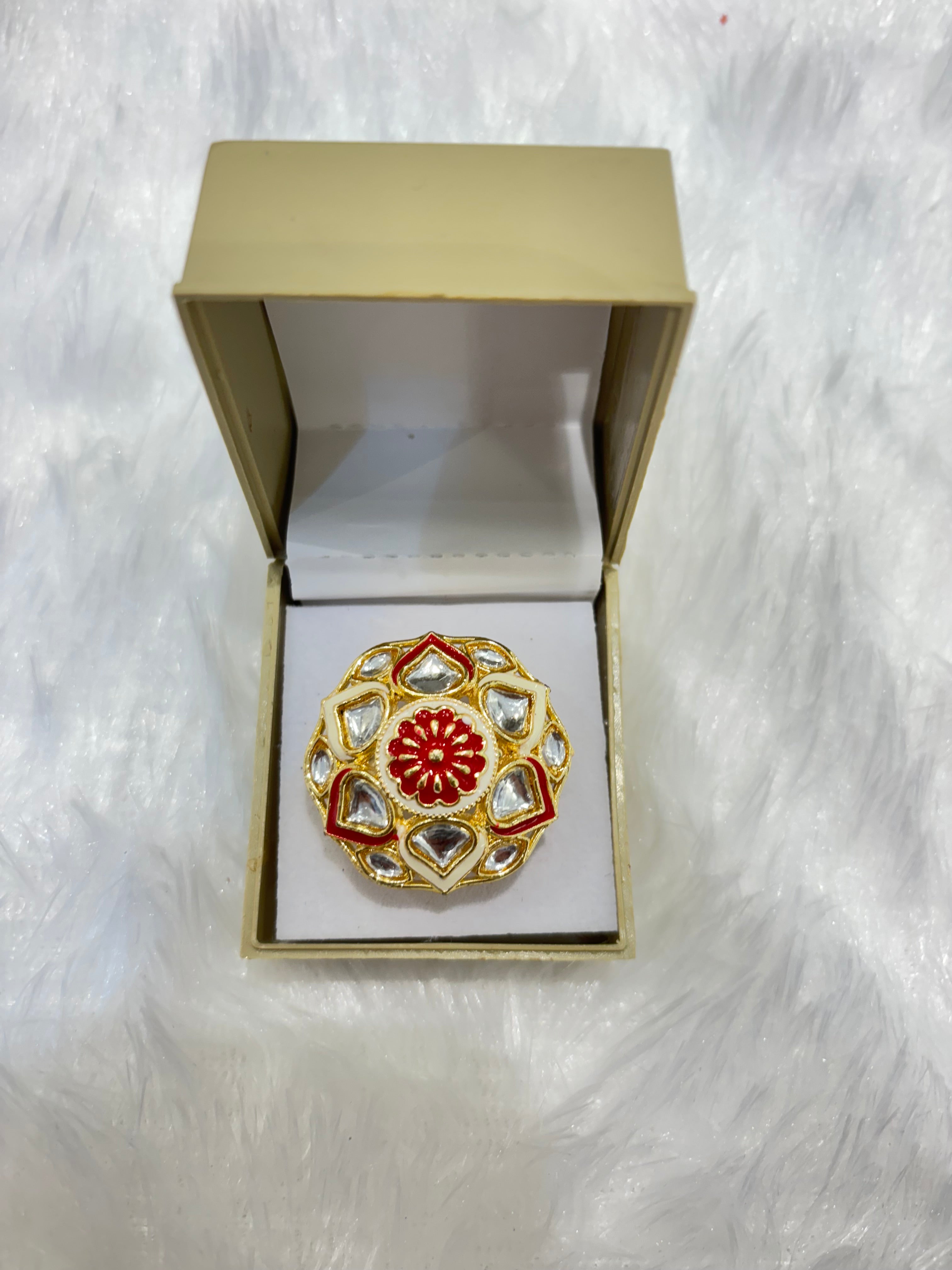 Add a vibrant touch with this red and white pearl ring, featuring lustrous white pearls paired with striking red stones in a stylish design. Perfect for weddings, festive occasions, and ethnic celebrations, this adjustable ring blends traditional charm with contemporary elegance, making it a standout accessory.