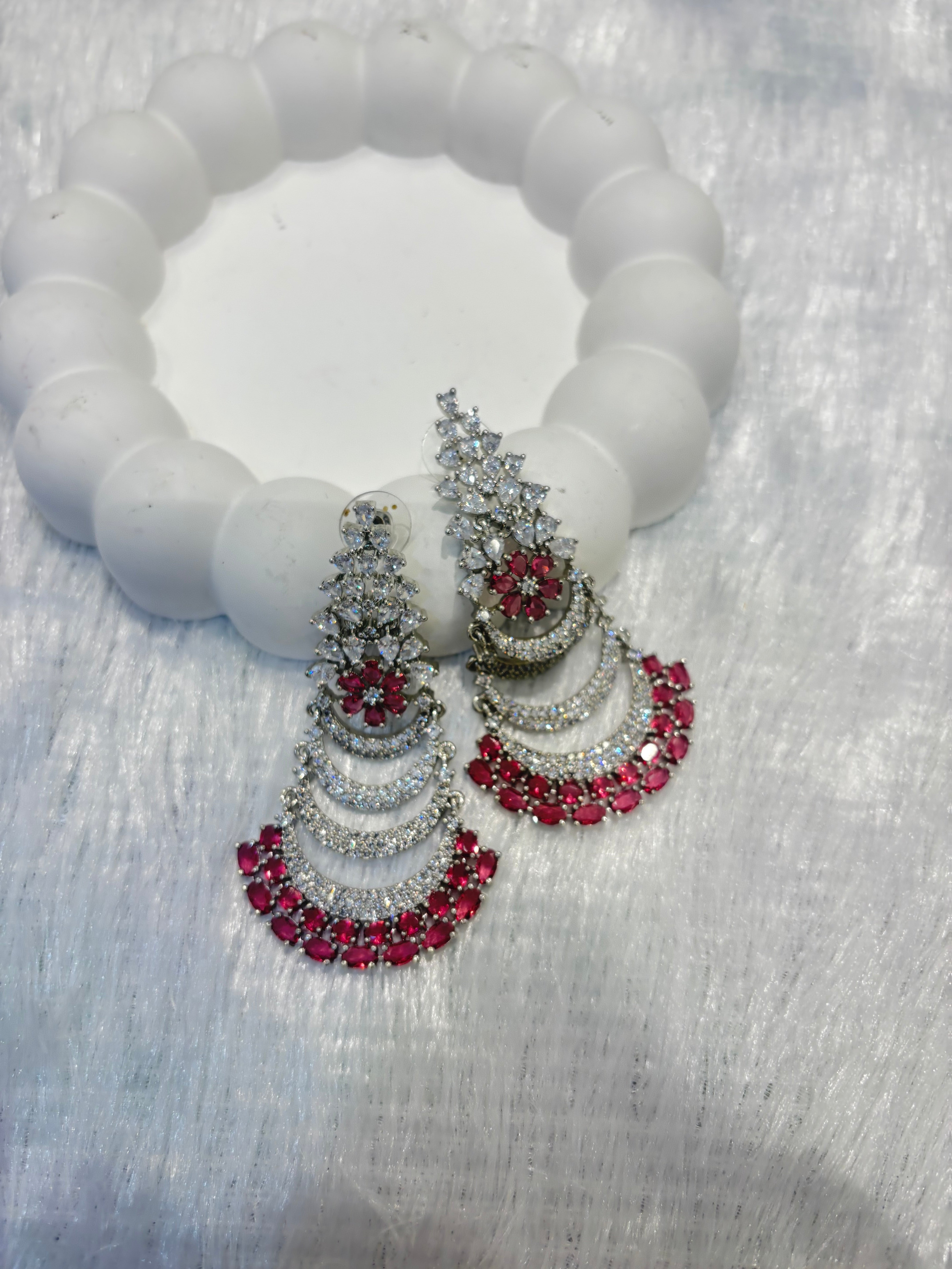 Dazzle with these elegant ruby and cubic zirconia chandelier earrings, designed in a stunning fan-shaped layered pattern. The earrings feature a delicate floral ruby motif at the center, cascading into graceful arcs of sparkling CZ diamonds and oval ruby stones. The unique blend of silver polish with deep red accents creates a timeless balance of modern glamour and traditional beauty.