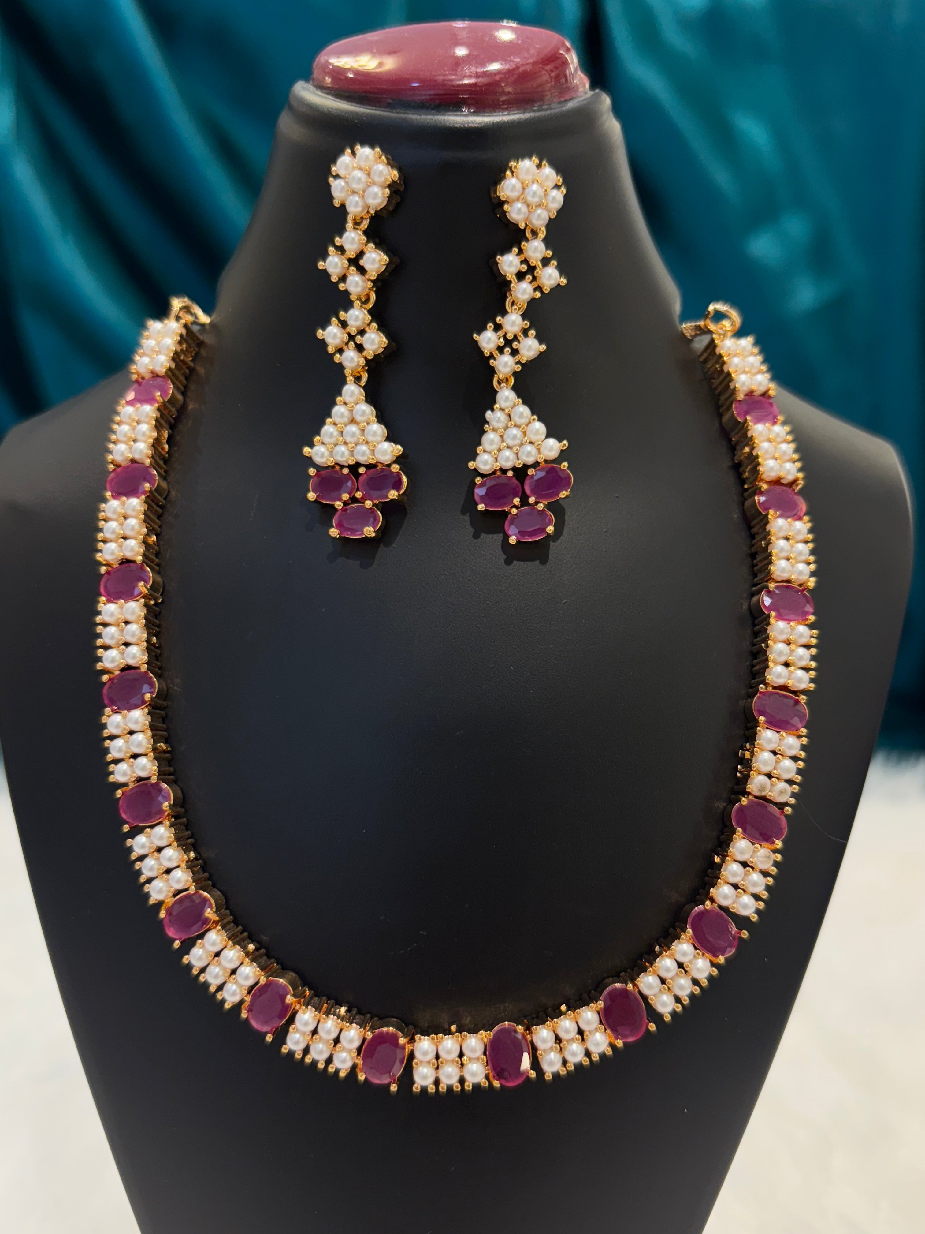 Radiate elegance with this stone and white pearl lined necklace set, featuring vibrant red ruby stones and lustrous white pearls in a graceful linear arrangement. The set includes a beautifully crafted necklace with matching earrings, perfect for weddings, festive occasions, and cultural celebrations.