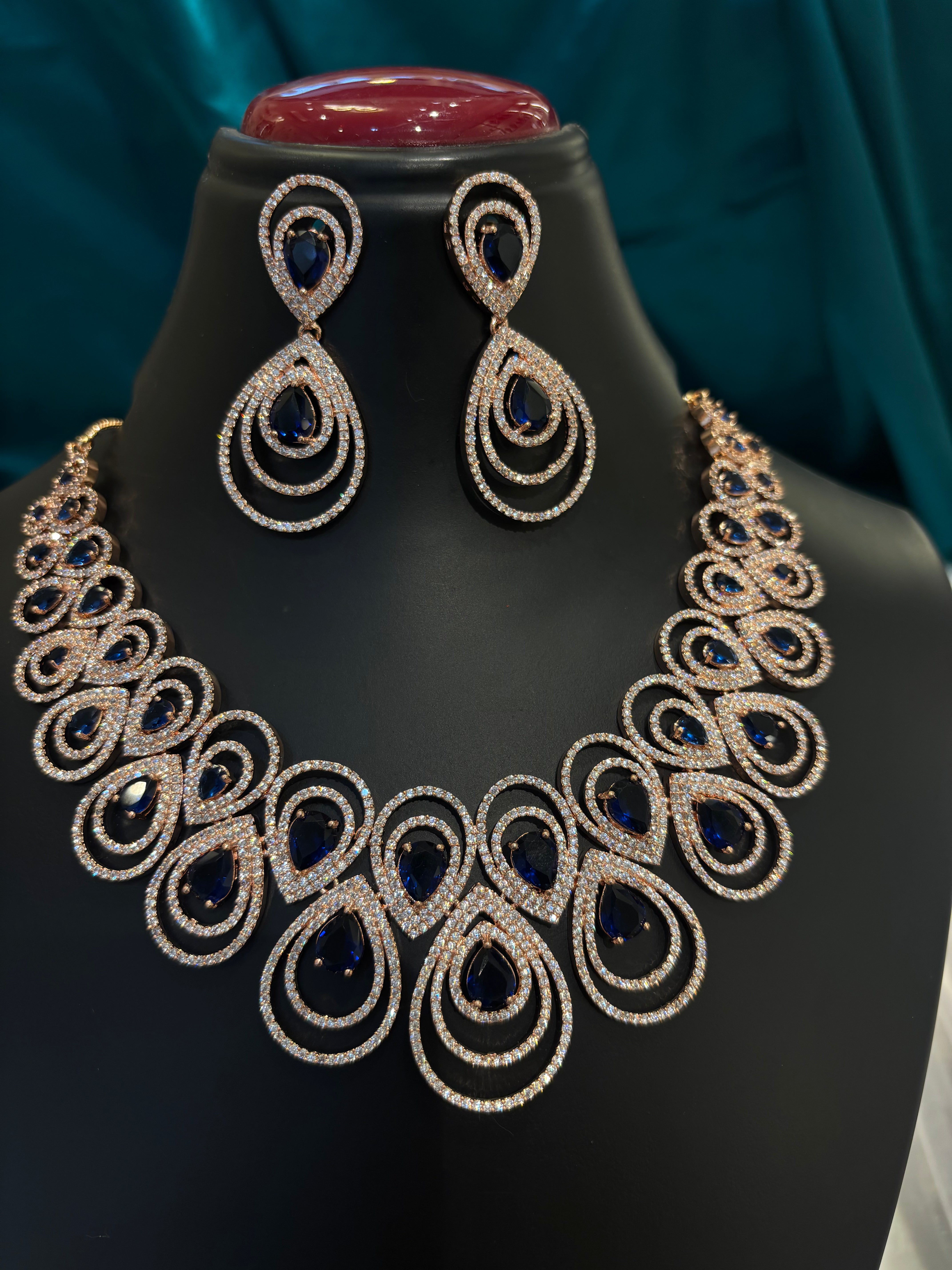 Make a stunning impression with this tear drop blue stone rose gold plated haar set, featuring rich blue stones arranged in graceful tear drop motifs on a warm rose gold base. The long, elegant design is perfect for weddings, receptions, and festive occasions.