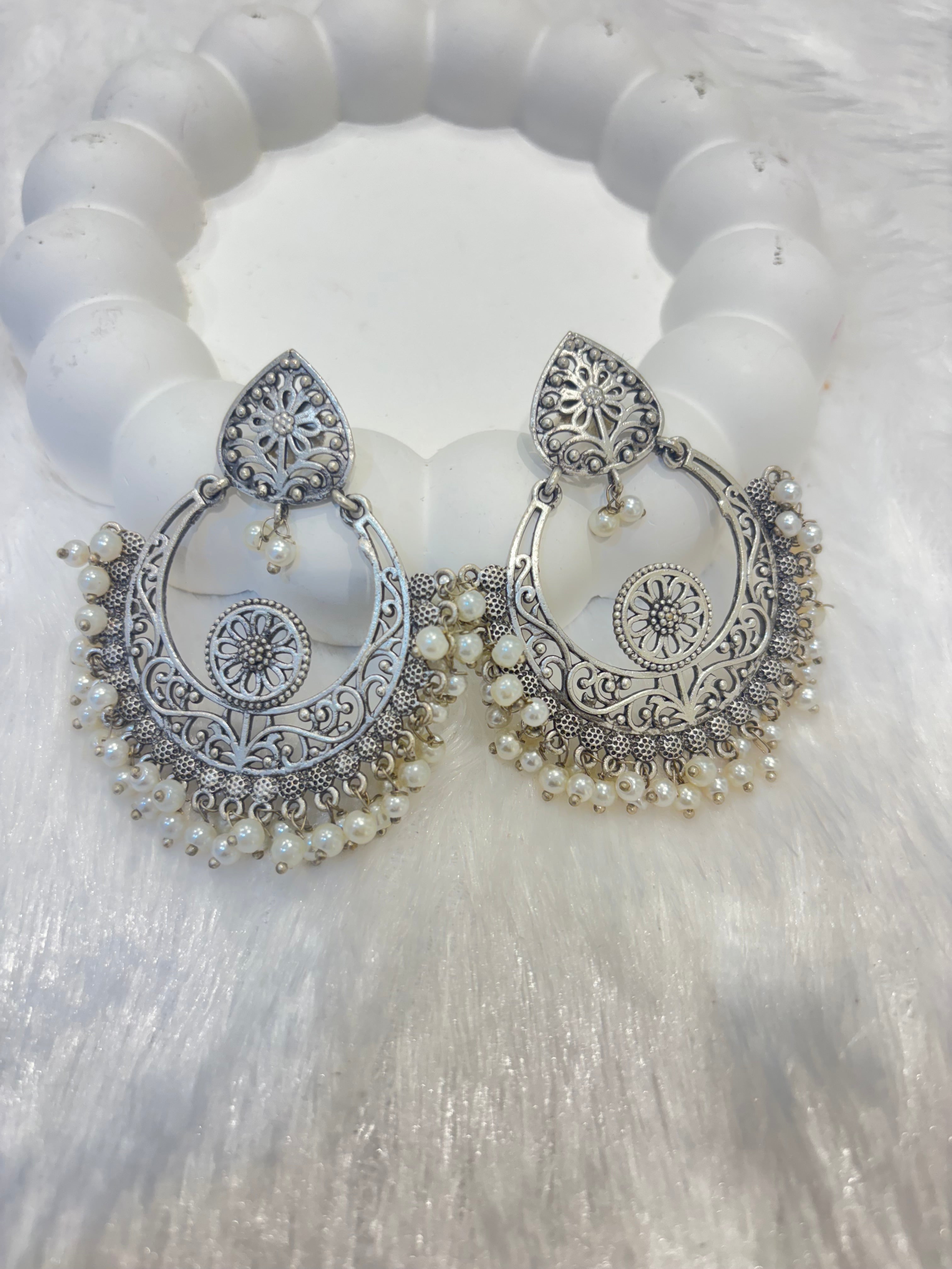 Elevate your ethnic look with these Oxidized Chaand Baali Earrings, inspired by the timeless crescent moon design. Intricately crafted in oxidized silver with detailed carvings, these earrings bring out a perfect blend of tradition and elegance.