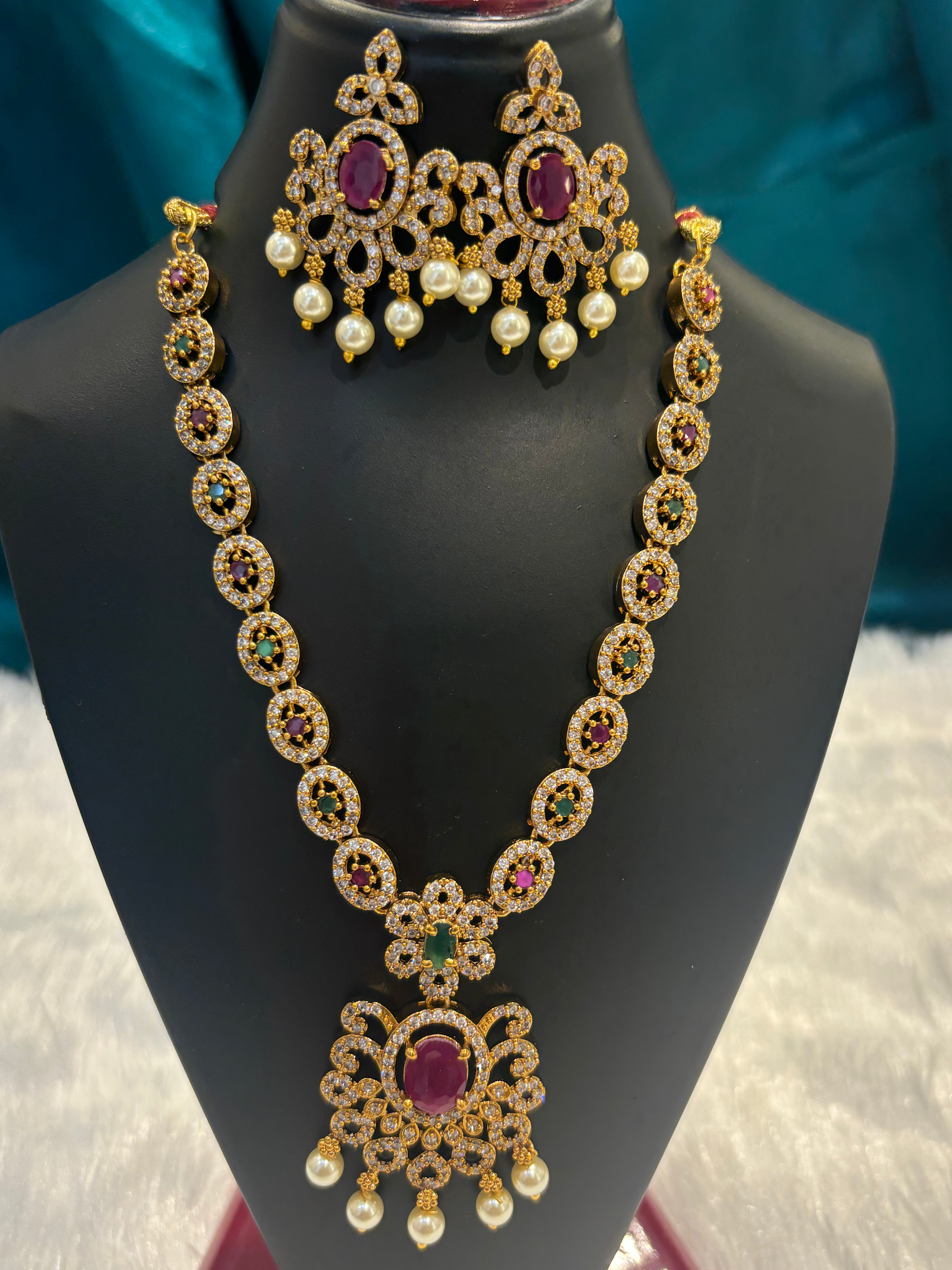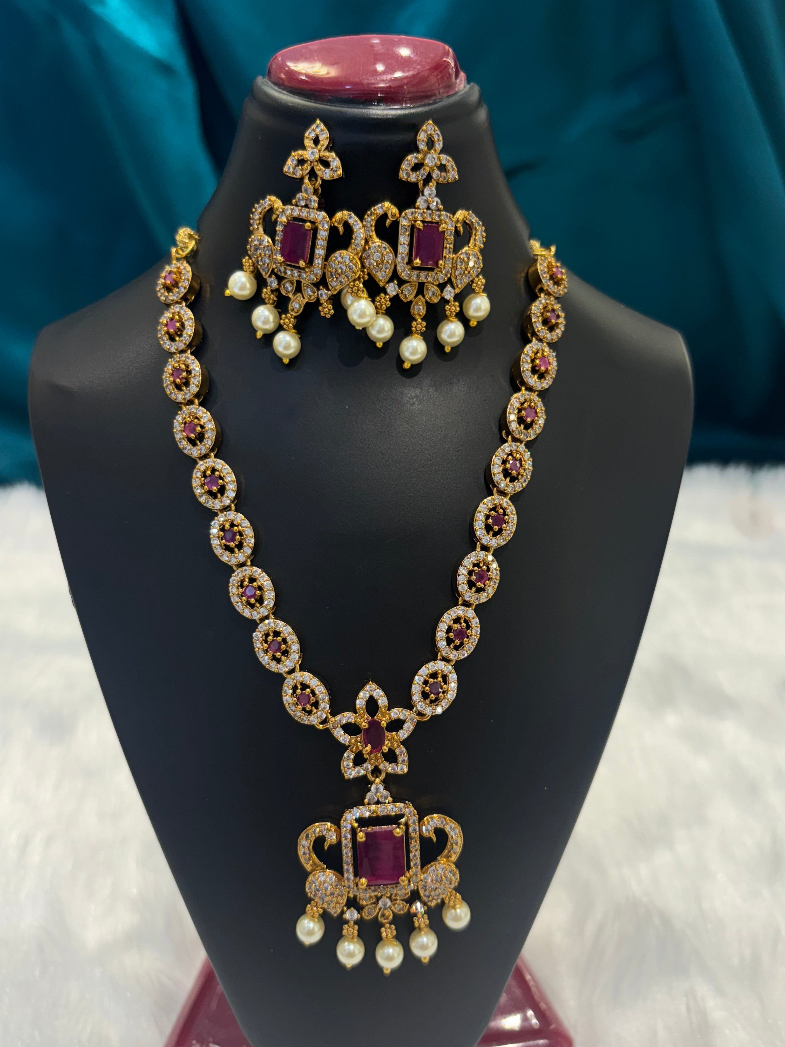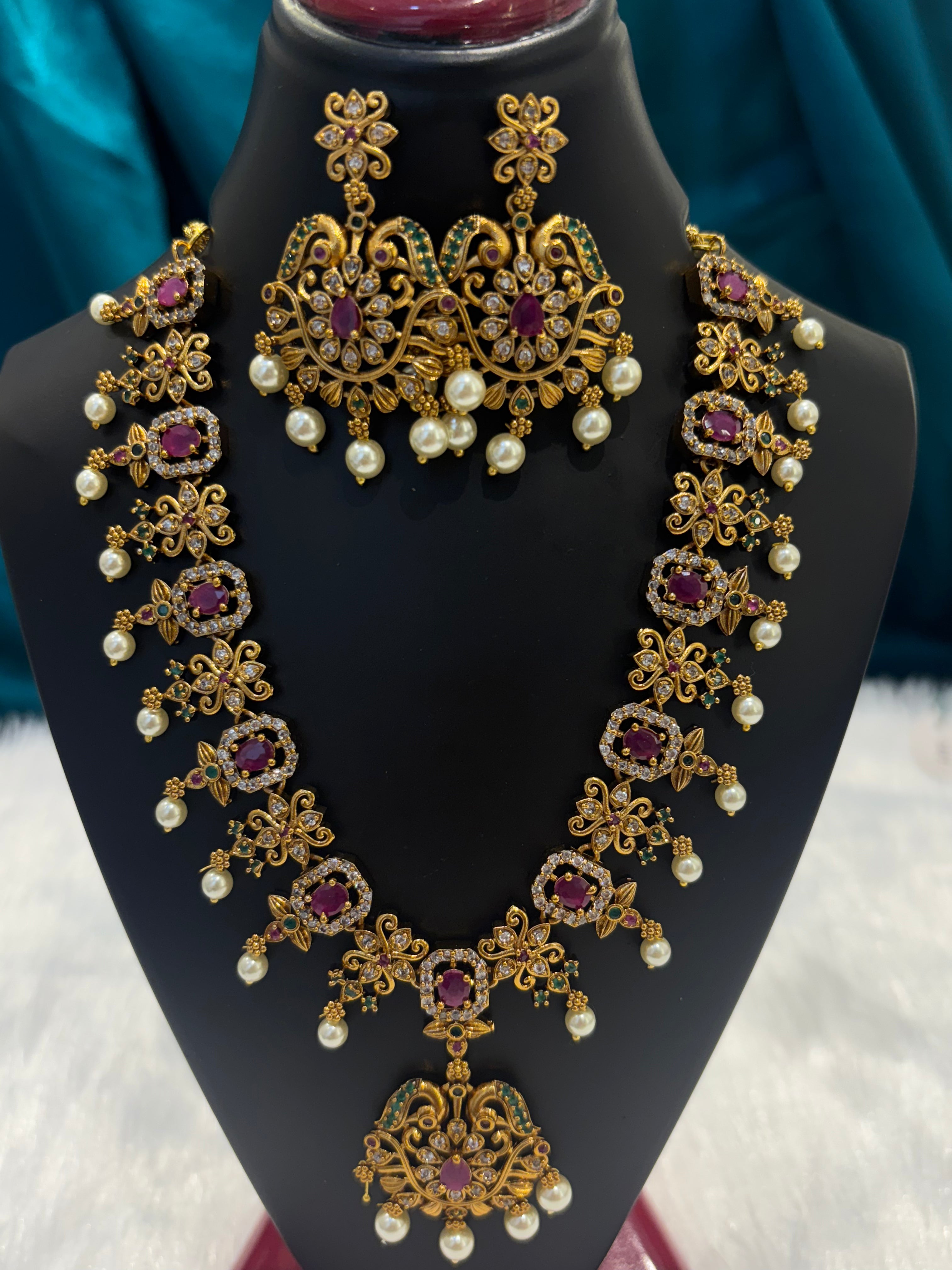 Embrace heritage elegance with this traditional mehendi polish necklace set, featuring deep coloured stones set in a rich antique gold finish. The set includes a beautifully crafted necklace with matching earrings, perfect for weddings, festive occasions, and cultural celebrations.