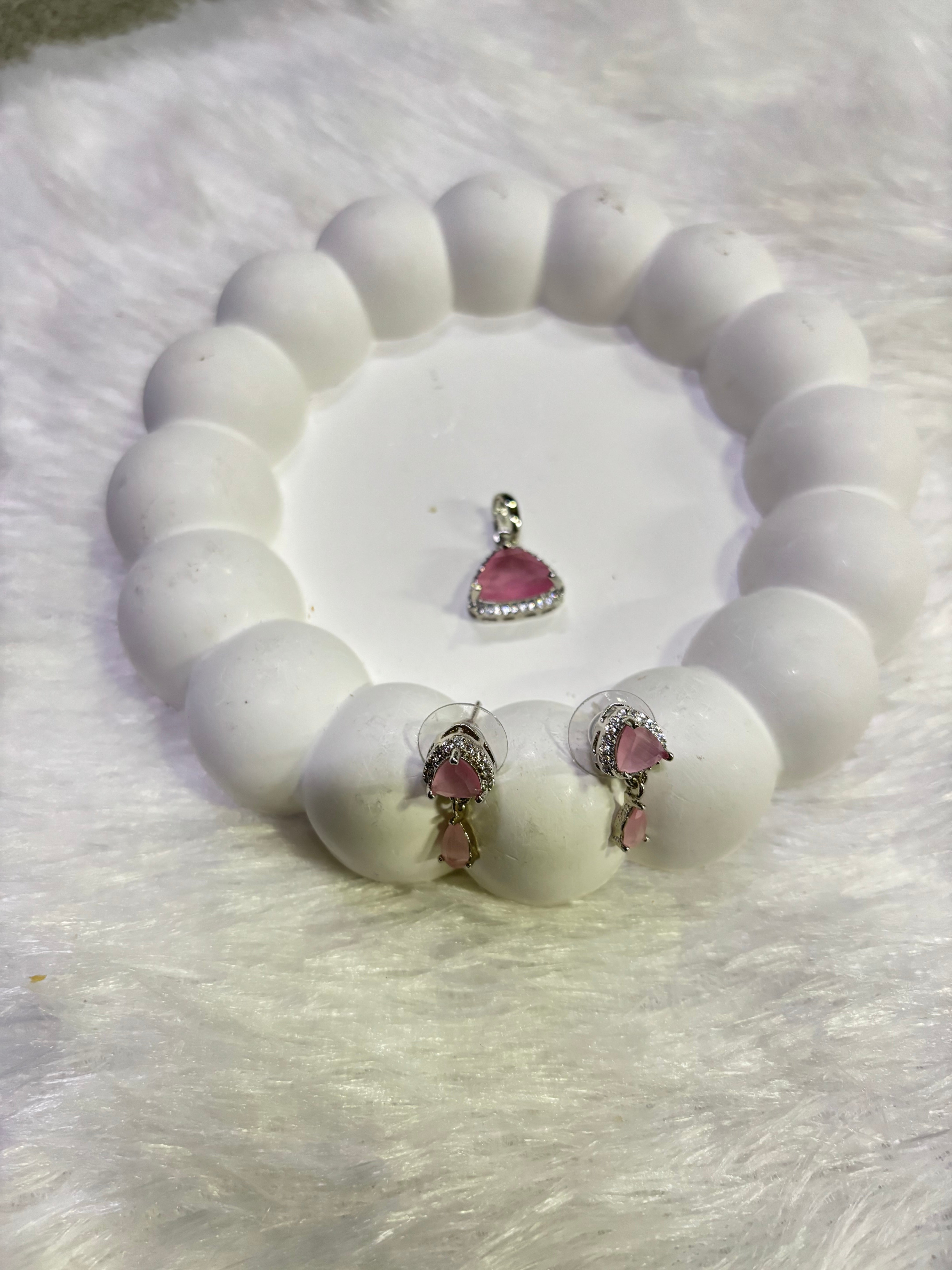 Add a pop of color and elegance to your jewelry collection with this Tri-Color Pendant & Earrings Set. Featuring teardrop-shaped stones in Pink, Green, and Blue, each set is framed with delicate American Diamond detailing for a timeless sparkle.