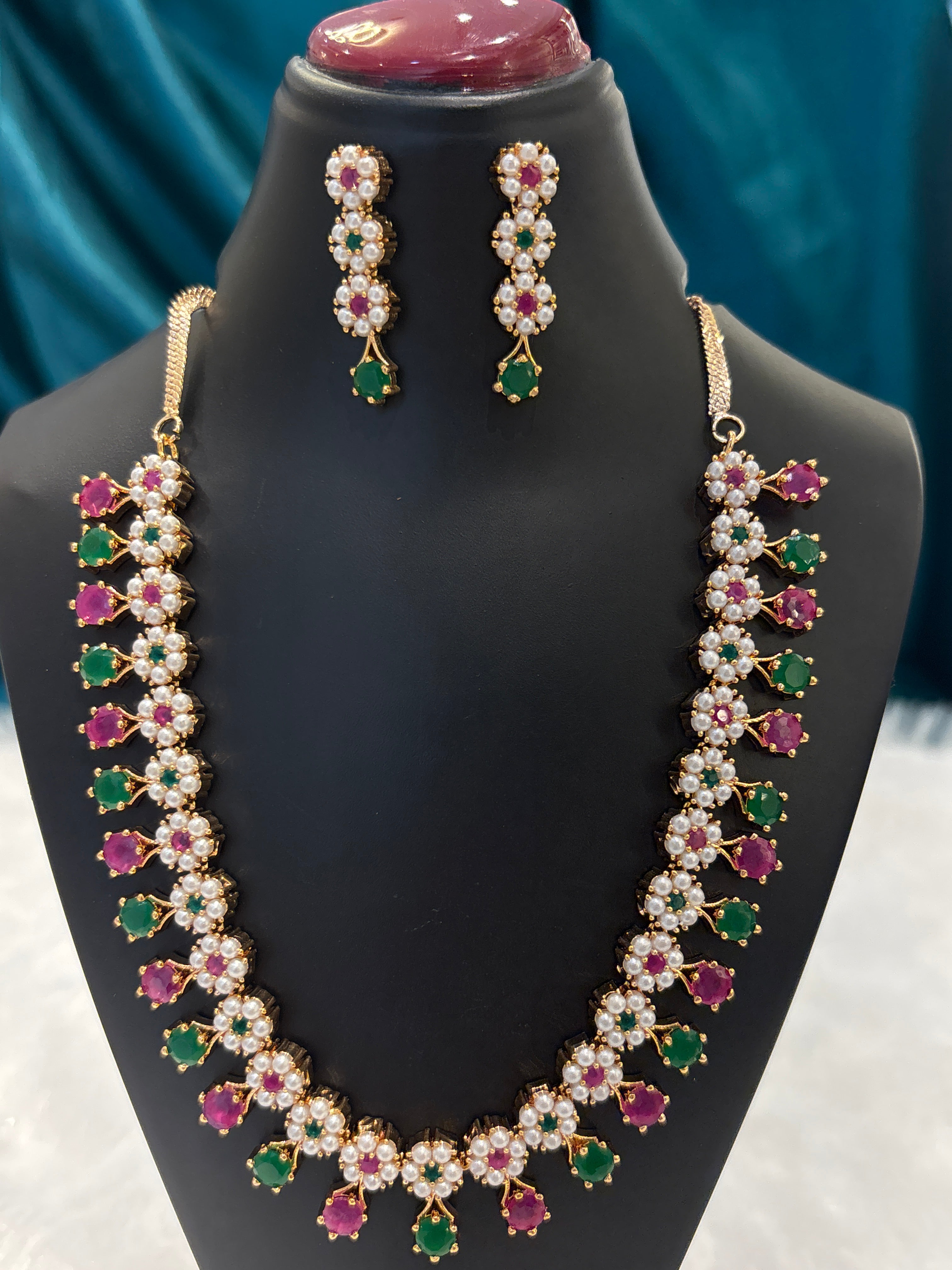 The combination of pearl purity, glittering stones, and intricate floral design creates a versatile piece that pairs beautifully with sarees, lehengas, gowns, and Indo-western outfits. Ideal for brides, bridesmaids, and women who love classic yet charming jewelry.