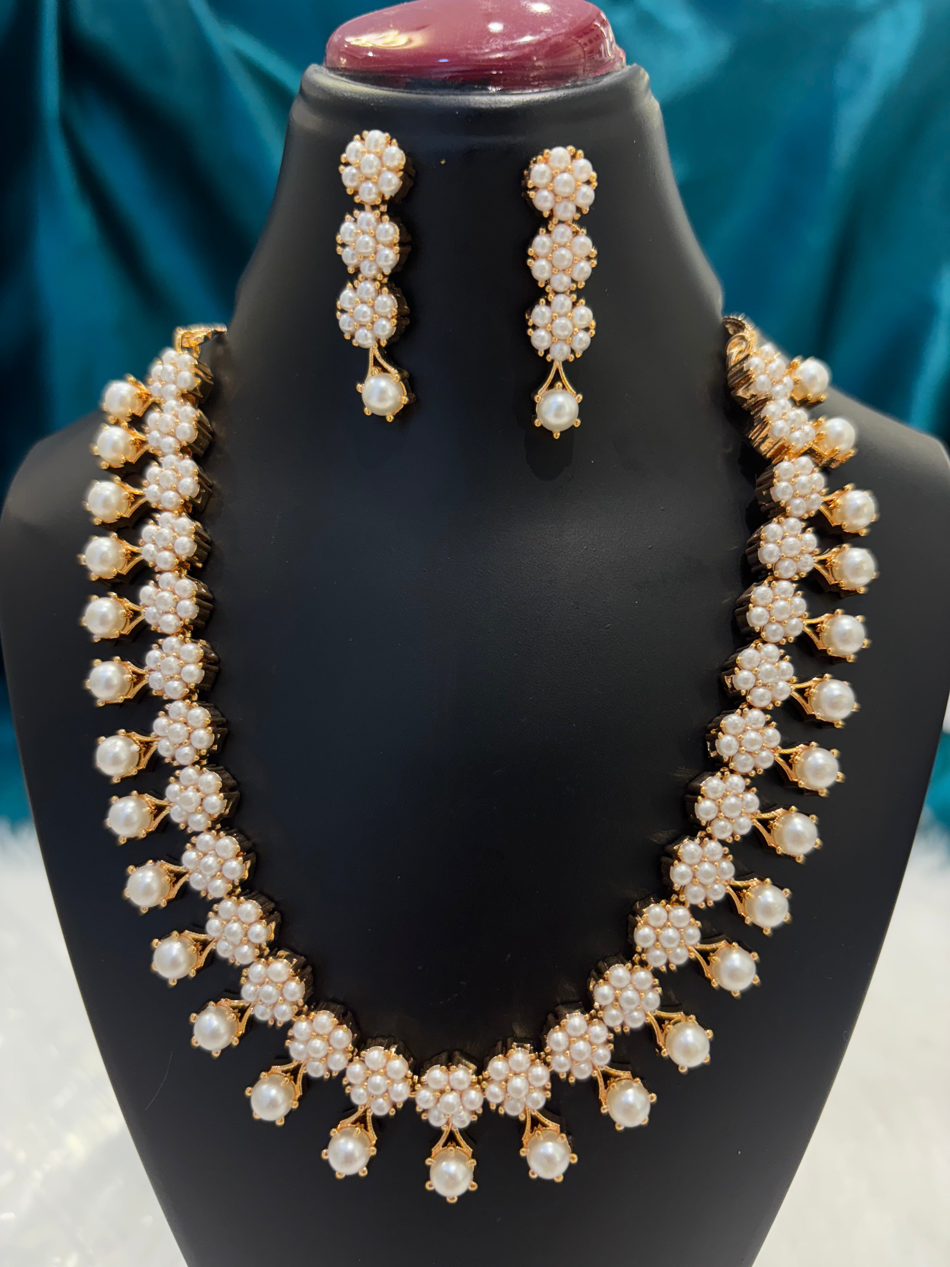 Radiate grace with this white pearl flower & stones necklace set, featuring delicate floral motifs adorned with lustrous white pearls and sparkling stones. Perfect for weddings, receptions, festive events, and special occasions, this set includes a graceful necklace and matching earrings designed for timeless elegance.